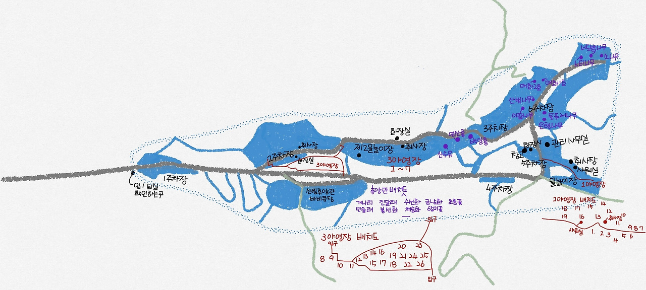 지난번 방문에서 3야영장에서 사이트를 찾지 못하는 여행객이 있어 안내를 해드린 적이 있는데 그런 경험 때문인지 배치도를 한번 그려보았다.