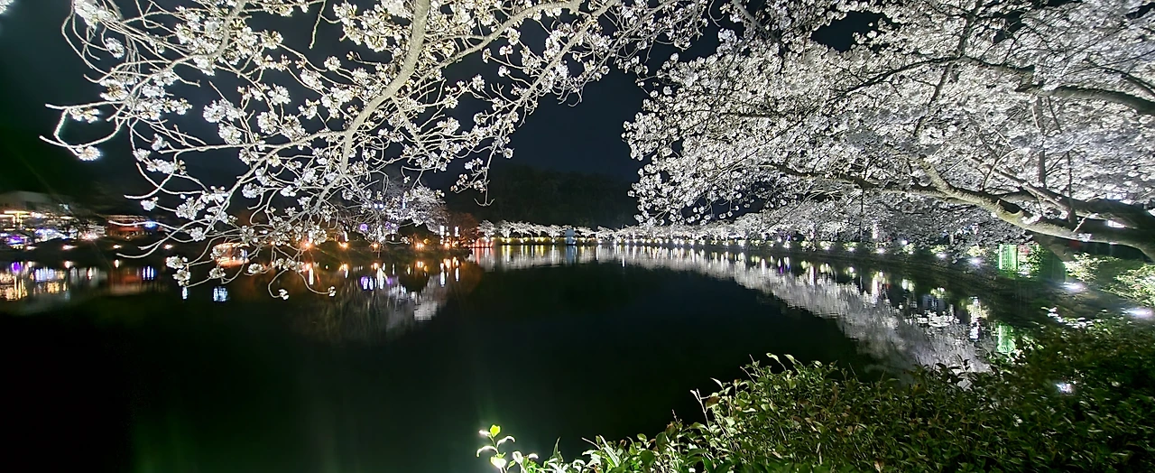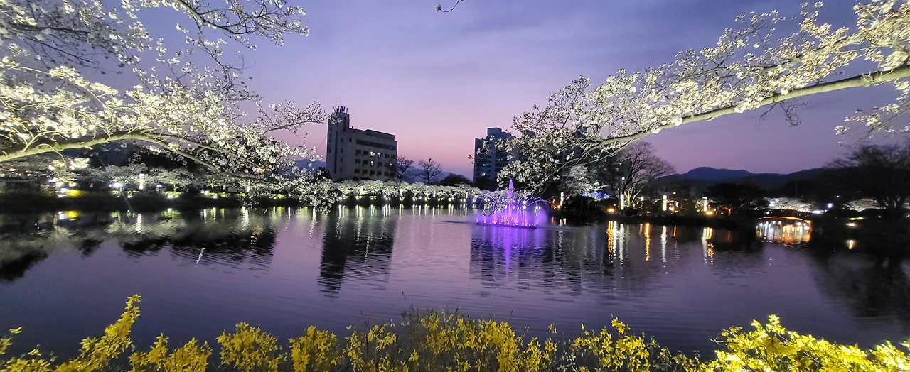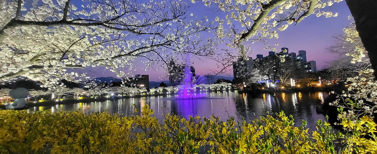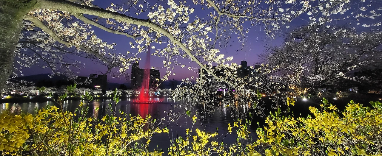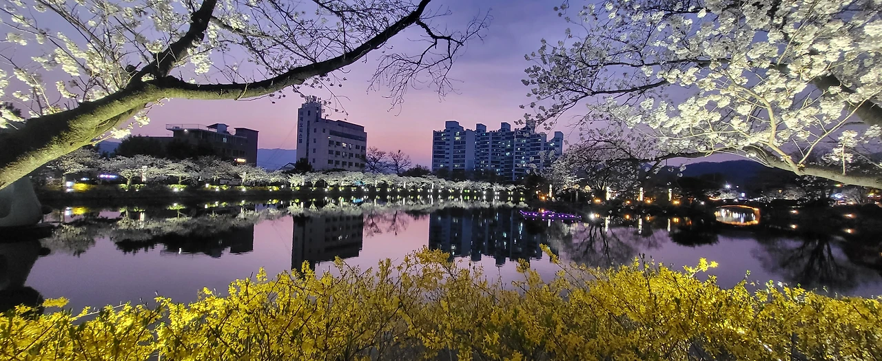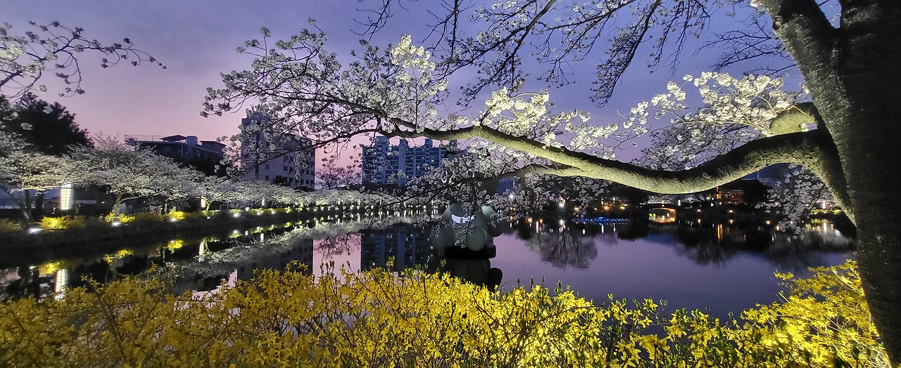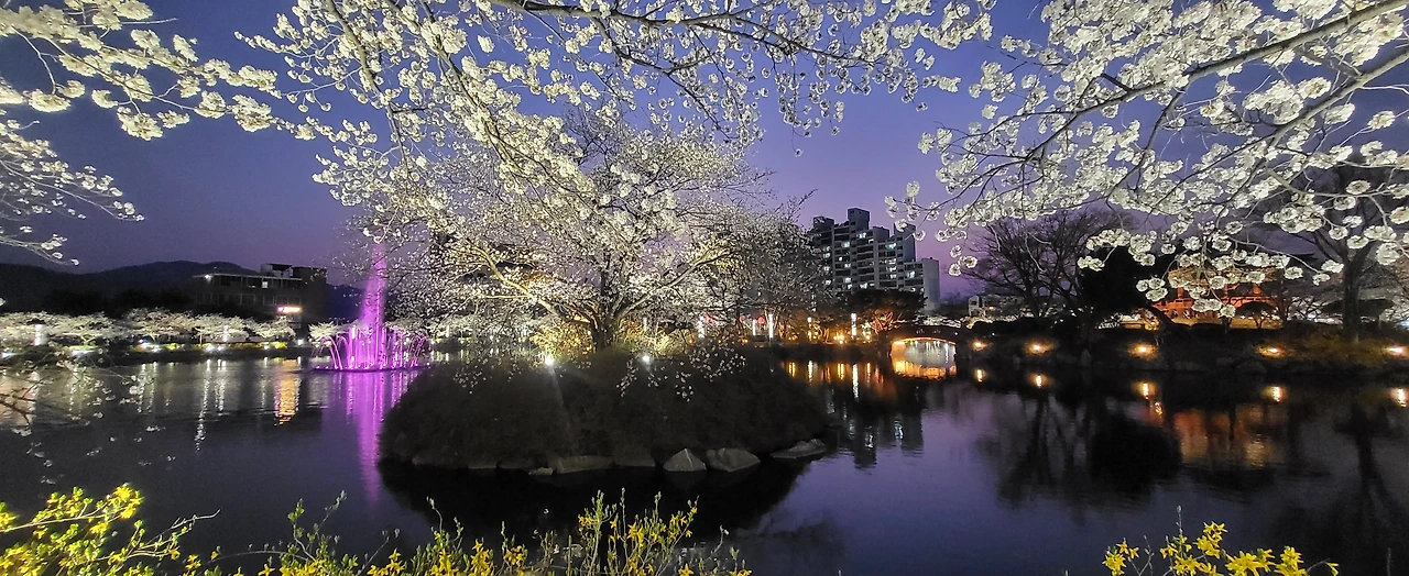 이곳은 나와 가장 친한 외국인친구와 함께 방문했던 경북 김천의 연화지라는 곳이다. 낮에 방문했을 때도 수많은 벚꽃들이 만개를 해서 너무나도 아름다웠는데 밤이 되고 나서야 진정한 연화지의 본모습이 눈에 들어와 아름다움에 감동을 했었다.