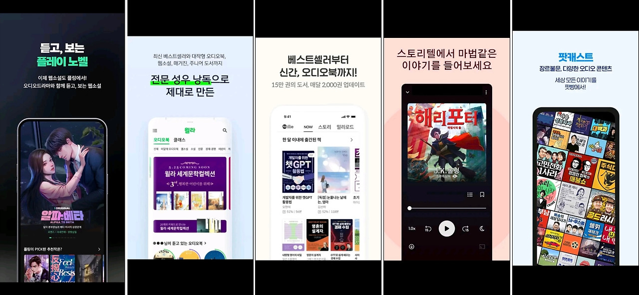 Play스토어 왼쪽부터 플링PLING, 윌라오디오북, 밀리의서재, 스토리텔, 팟빵