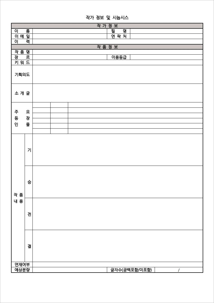 인터넷에 웹소설 시놉시스 하면 양식이 많이 있지만 난 여러 양식을 보고 내가 편한 대로 만들어서 사용 중이다.