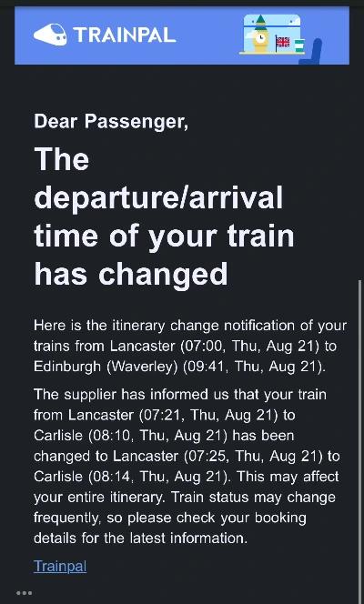 "07:05에 지연 출발하려던 에든버러행 기차가 더욱 지연되어 07:14..."