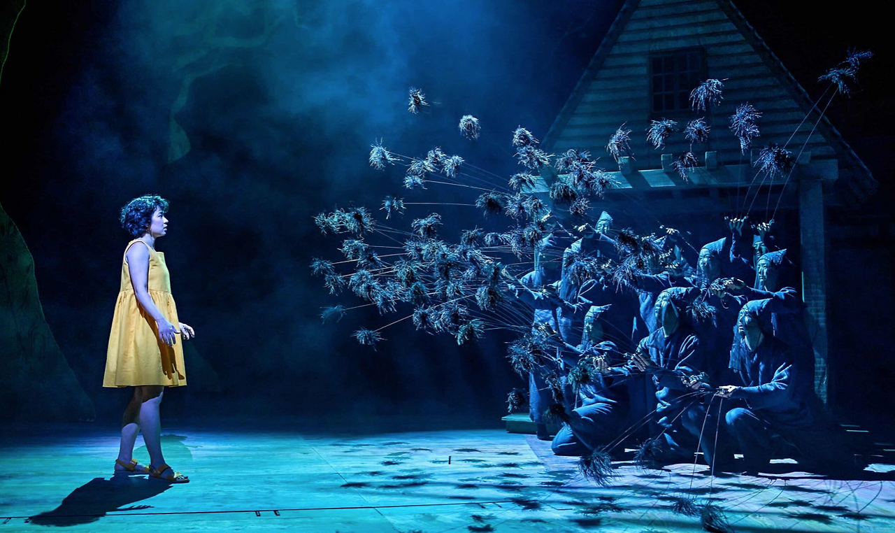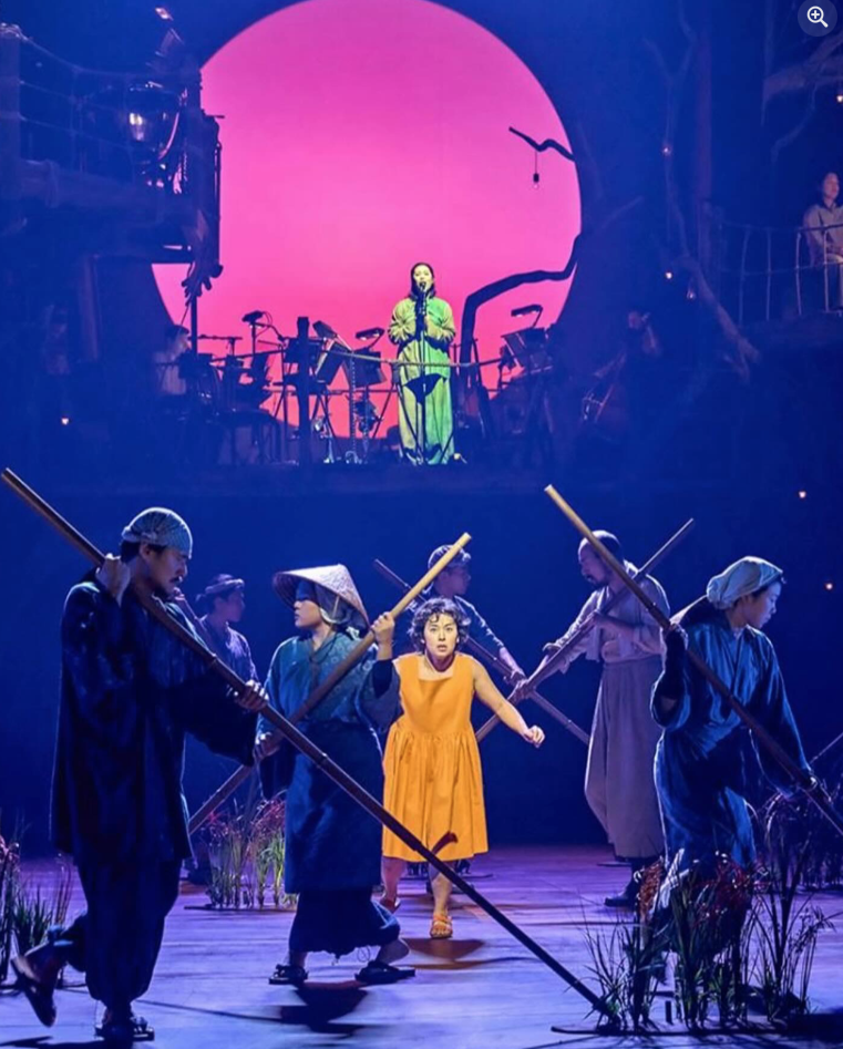 언니가 동생 메이를 찾는 씬. 농가들을 스쳐 벼가 심긴 논을 헤치고 다니는 이 씬이 심플한 오브제와 주변 배우들의 군더더기 없는 동선에 의해 무대 위에서 촘촘하고 아름답게 엮어진다. 무수한 연습과 스케치들, 또 연습이 있었을 이런 장면들마다 나는 감탄, 또 경이로움을 느꼈다. '이거구나'. 내가 공연을 보면서 희열을 느끼는 순간은 바로 이거구나. 배우들의 땀으로 이루어진 묵직한 어떤 순간과의 조우.