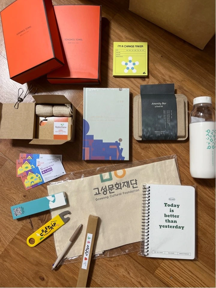 숙소로 돌아와 웰컴키트를 풀어보니, 이렇게나 다양한 것들이 들어있다. 주최 측인 빛나르고가 고민하고 고민해 담아 두었을 정성이 읽히는 듯하다. 이곳에 머무는 동안 분명히 택배 깨나 시켜댈 것을 예측한 택배박스 커터, 친환경 샴푸바, 바디바, 설거지 비누 세트. 고급 수건과 그날그날의 To-Do리스트 노트, 고성의 작가분들이 쓴 글을 모은 책(후에 엄청난 보물이 된다), 게다가 지역의 (유일한) 상권 - 금강산 슈퍼-을 고려한 5,000원 쿠폰과 아트카페 쿠폰까지. 배려가 뚝뚝 떨어지는 선물을 받아보면서 '아아. 설렁설렁하긴 글렀는걸?'이라고 헛웃음이 배어 나왔다.