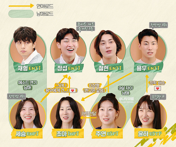 최근 한동안 TV를 멀리했다. 나는 TV를 보는데 에너지를 많이 소비하는 편이라 어지간히 꽂히는 프로그램이 생기기 전에는 모든 연예뉴스를 주로 신문기사(혹은 뉴스)로 보는데 연애남매에 대한 이야기를 기사로 보다가 11회를 보고 급 흥미가 생기기 시작했다. 결말이 얼마 안 남은 것 같은데 기존 러브라인이 다 흐트러졌다고...? (물론 기사를 통해 등장인물이나 러브라인같은건 이미 다 알고 있었던 상태) 그래서 하이라이트를 봤다. 그랬더니 1커플만 새로 등장한 것이 아니라 견고하다고 여겨졌던 커플도 위기가 온 것이다. 그래서 내친김에 1화부터 전 화를 다 몰아보고 못본 영상은 유튜브에서 찾아보고 암튼 관련영상이란 영상은 다 본 듯 하다. 그런데 단순히 영상보는 재미에서 그치지않고 이렇게 브런치에 글까지 쓰게 된 이유는 바로 용우라는 출연자의 심리가 신기해서이다. 일단 <연애남매>를 보지않은 분들을 위해 잠시 출연진 소개를 하자면 5남매가 한 집에 모여서 연애프로그램을 찍는 것인데, 출연진들이 남매인지라 가끔씩 부모님들도 나오시고 또 혈육끼리 서로의 로맨스를 보다보니 조언도 해주고 격려도 해주는 등 일반 연애프로그램에 비해서는 시트콤이나 가족예능 느낌이 강하다.