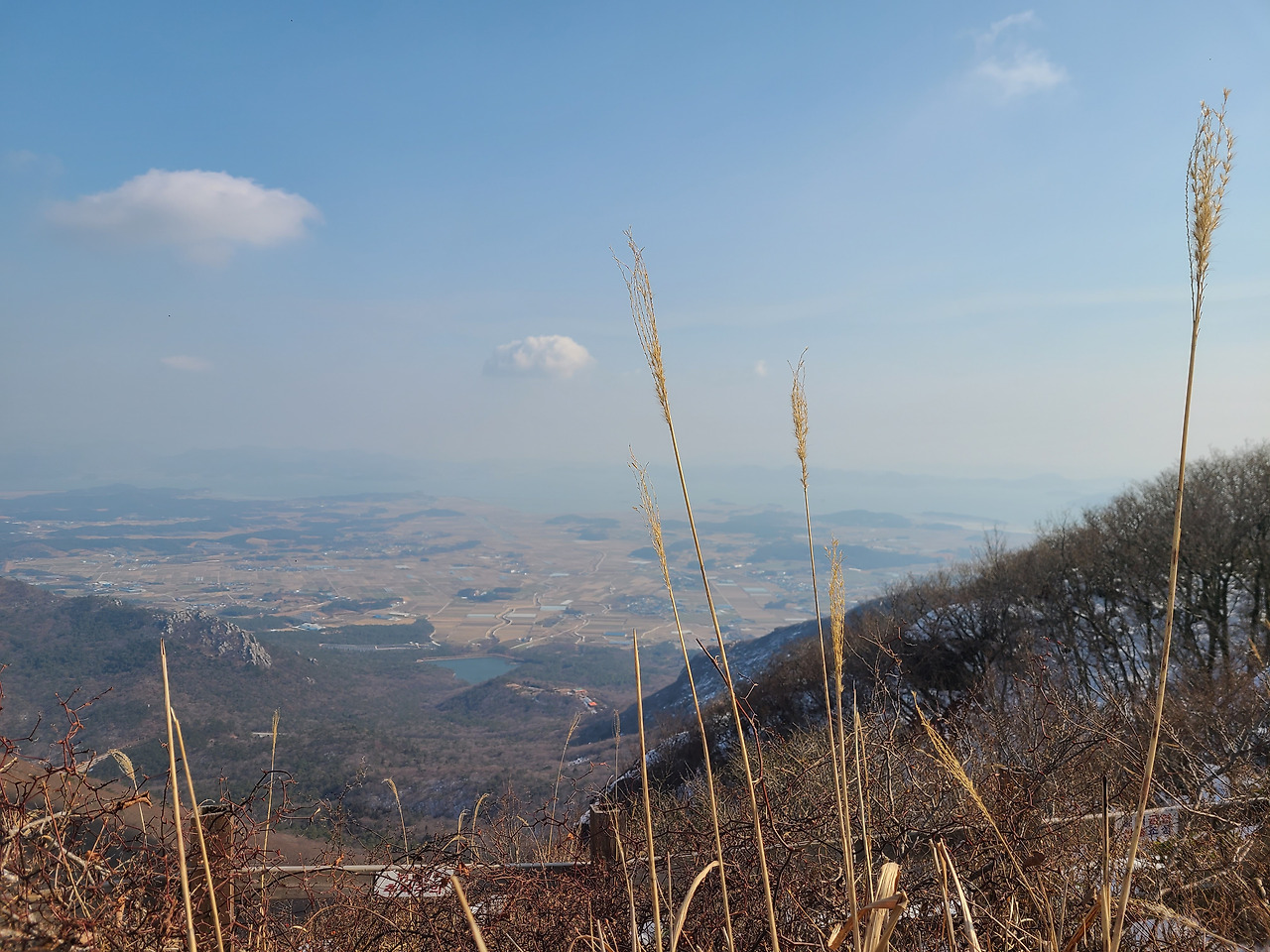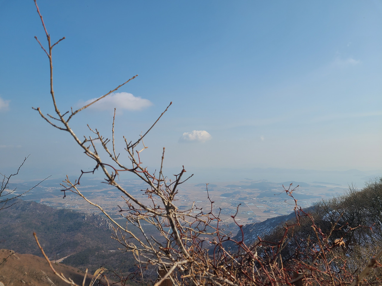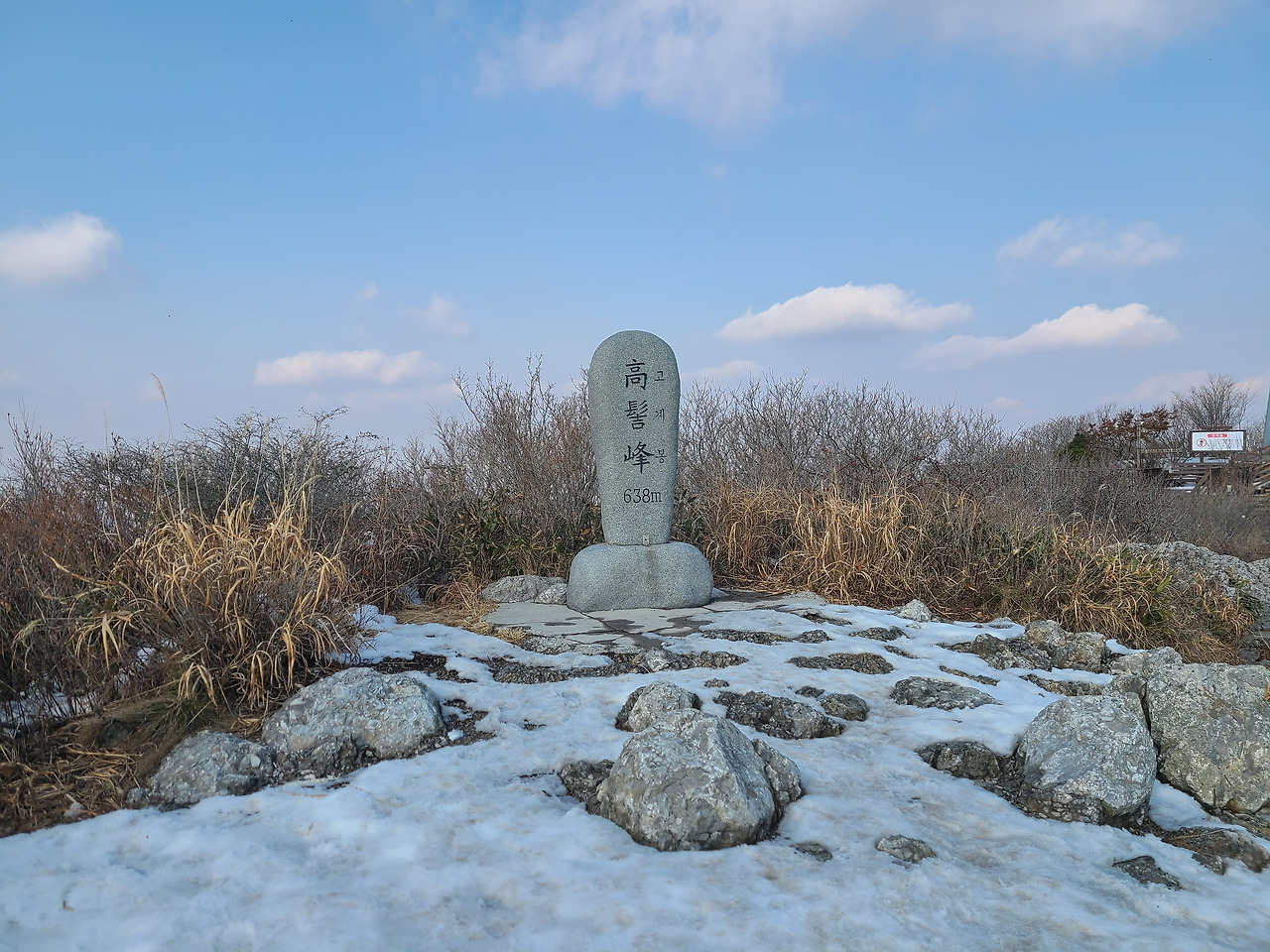 눈 쌓인 해발 638m 고계봉 표지석 곁 산등성이들 녹지 않은 눈꽃 바람에 푸석푸석 날리는 나 홀로 카페. 내 엉덩이는 바위를 따뜻하게 덮어주고 바람이 전하는 쓸쓸함은 가슴이 막아주며, 그 누구도 방해받지 않고 보온병에 챙겨 온 커피 한잔의 여유 그리고 얼굴과 손등에 가득 스킨십해 대는 햇살과 잘 놀고 있는 다시 오지 않을 지금이다.