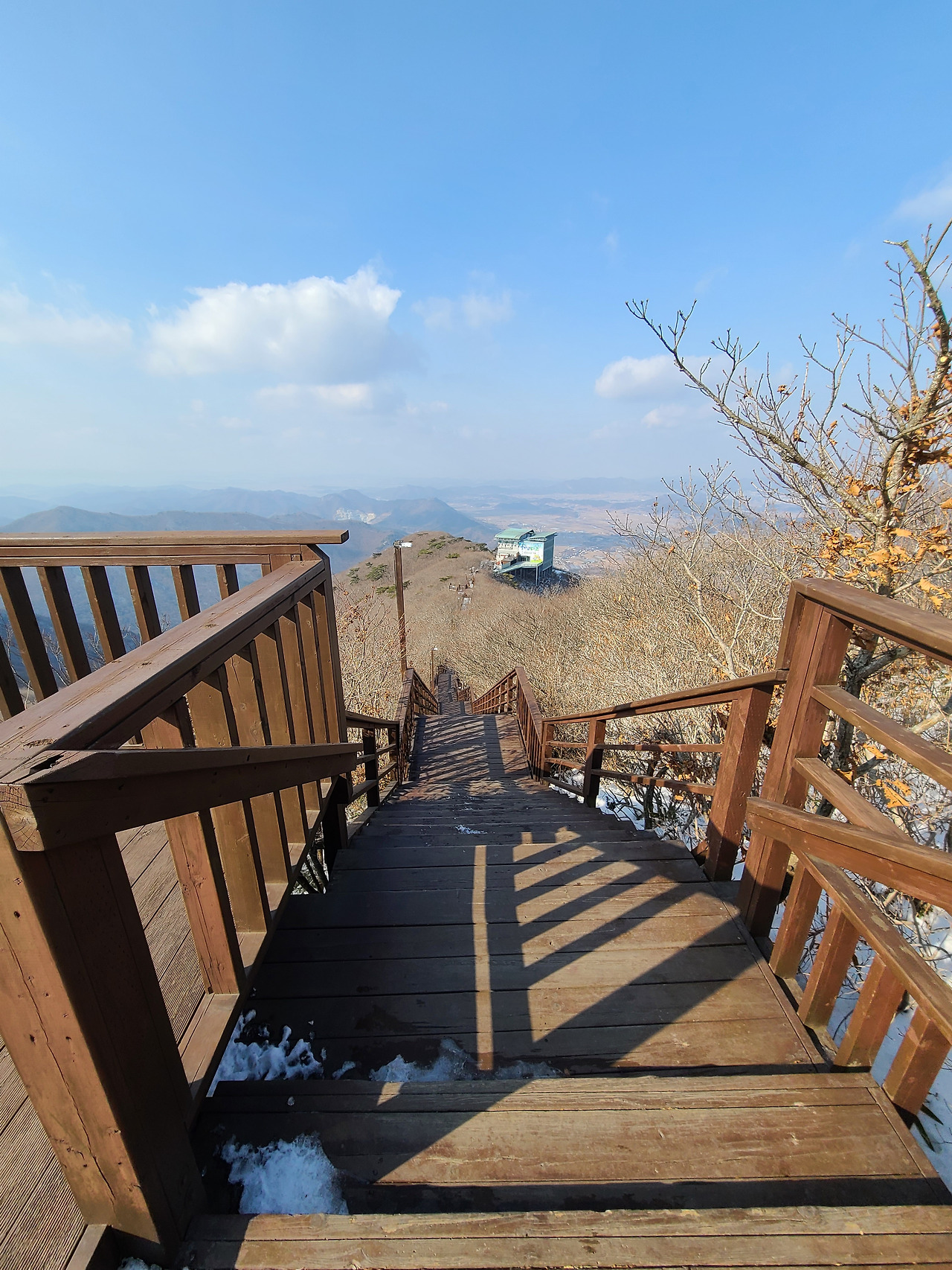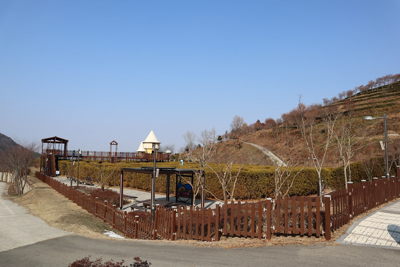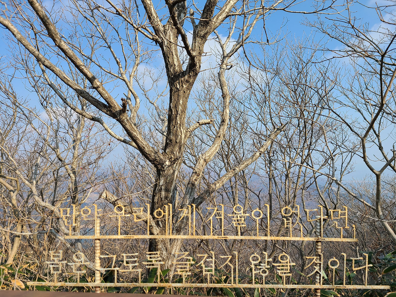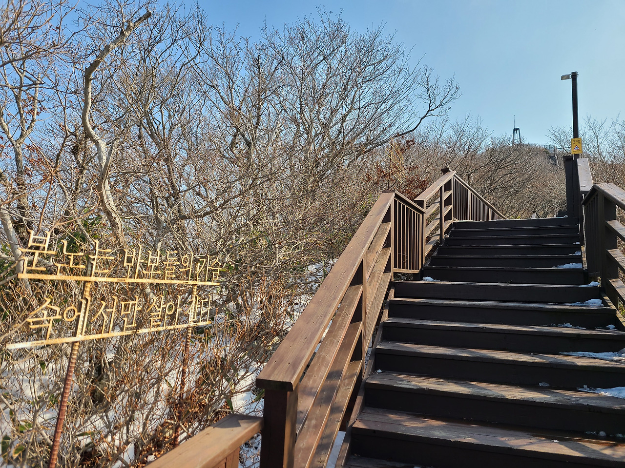 286개의 목재산책로 계단 오르다 뒤돌아서면 멀리 한반도 지도마을이 보인다. 앙상한 겨울나무 배경이 되지 않아서일까 계단 군데군데 마주치는 좋은 글귀들 선명하지 않아 아쉬움이 남는다.