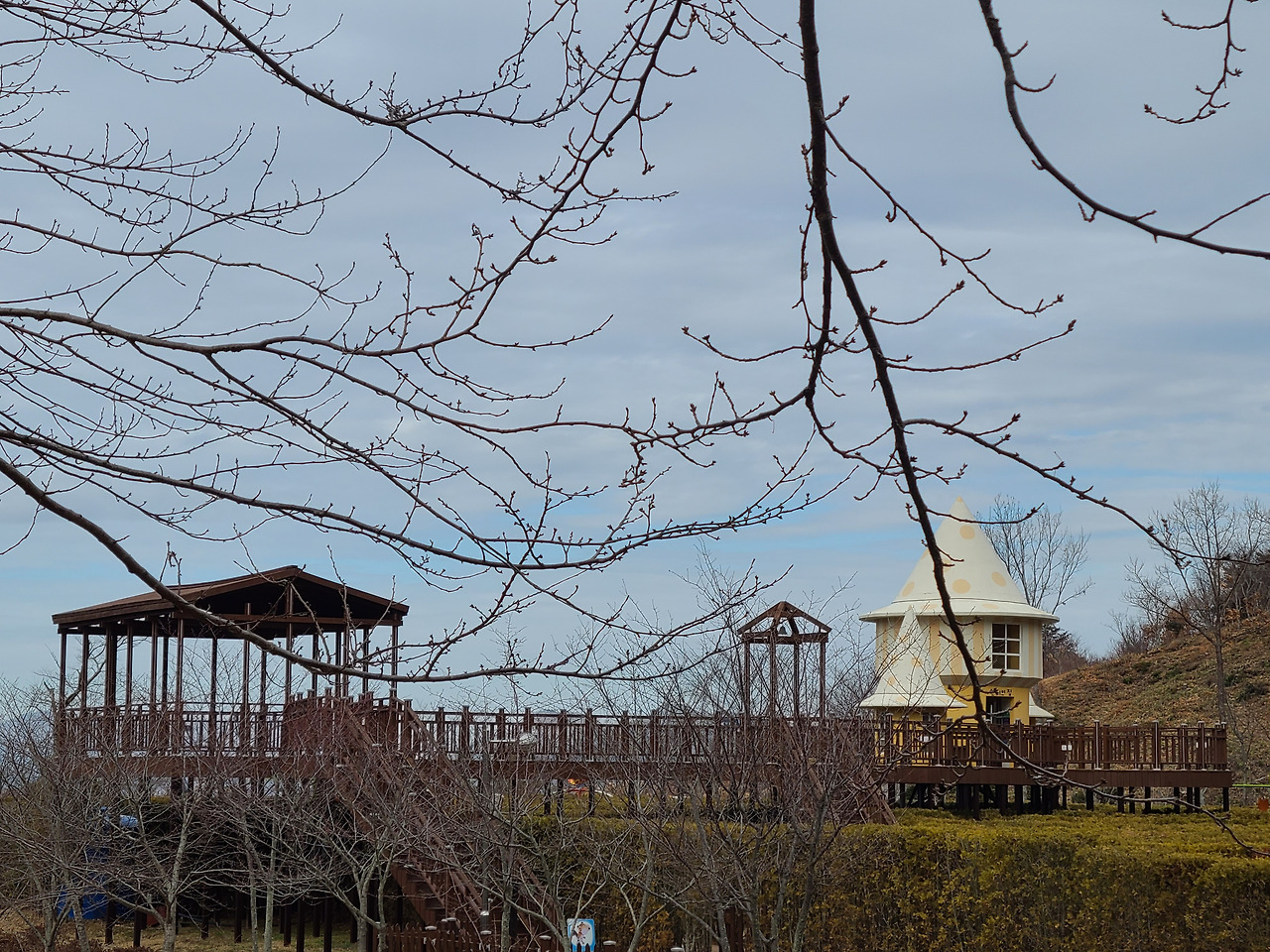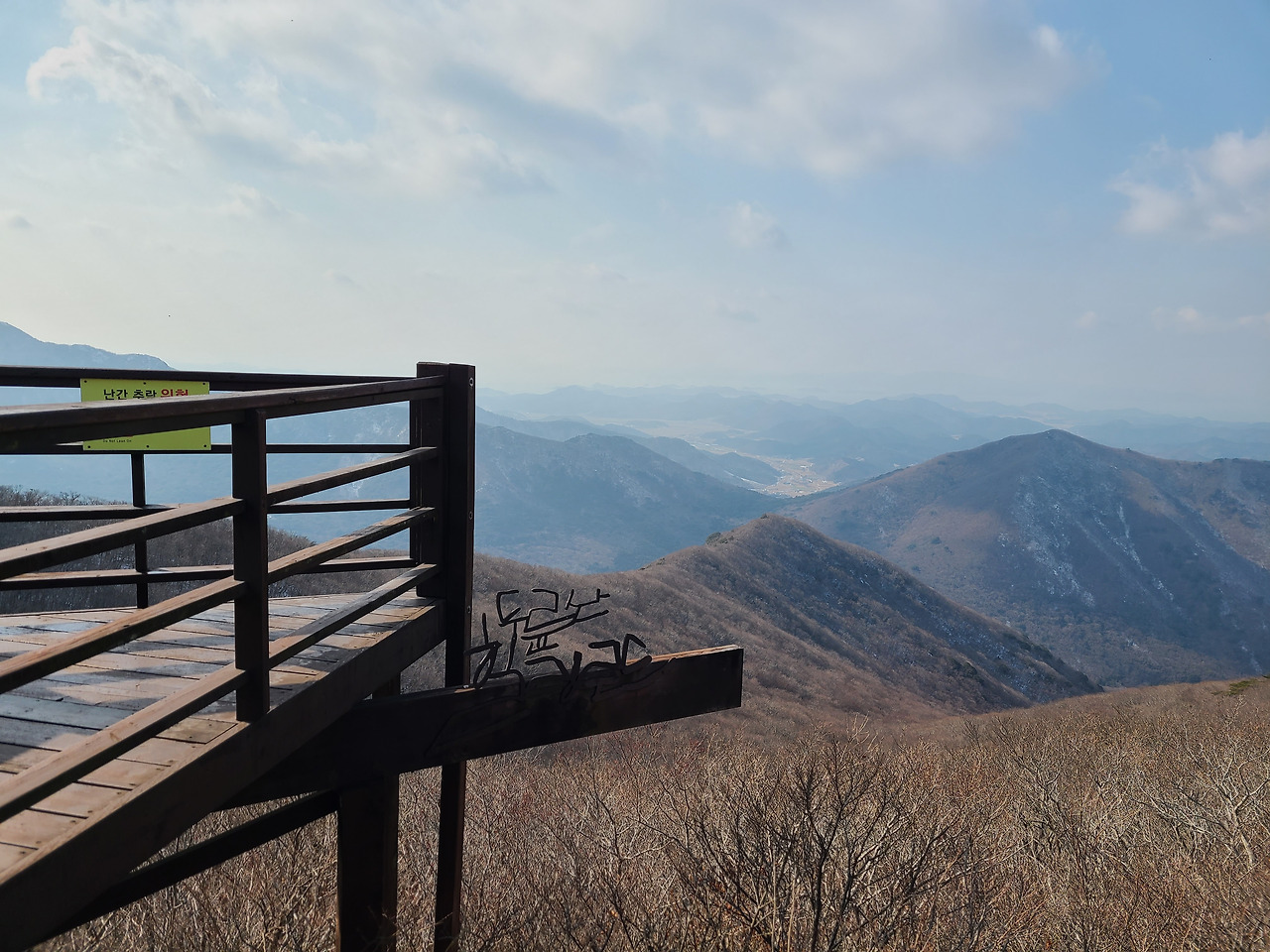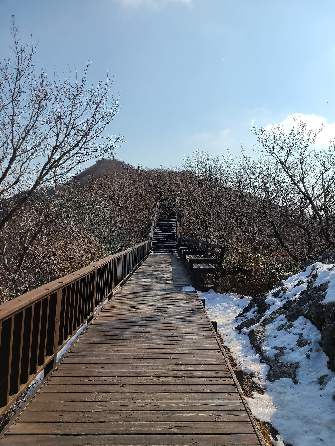 286개의 목재산책로 계단 오르다 뒤돌아서면 멀리 한반도 지도마을이 보인다. 앙상한 겨울나무 배경이 되지 않아서일까 계단 군데군데 마주치는 좋은 글귀들 선명하지 않아 아쉬움이 남는다.