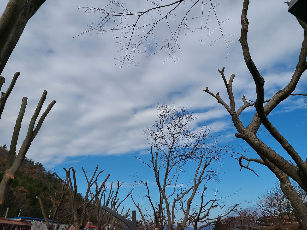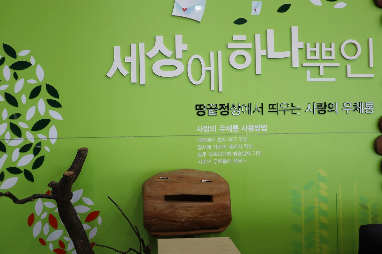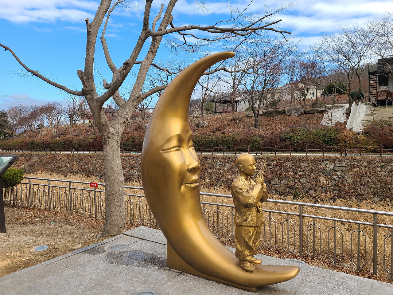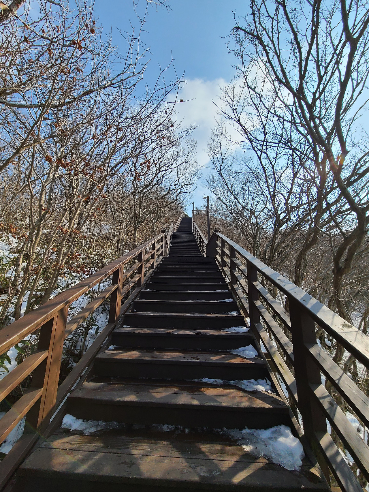 286개의 목재산책로 계단 오르다 뒤돌아서면 멀리 한반도 지도마을이 보인다. 앙상한 겨울나무 배경이 되지 않아서일까 계단 군데군데 마주치는 좋은 글귀들 선명하지 않아 아쉬움이 남는다.