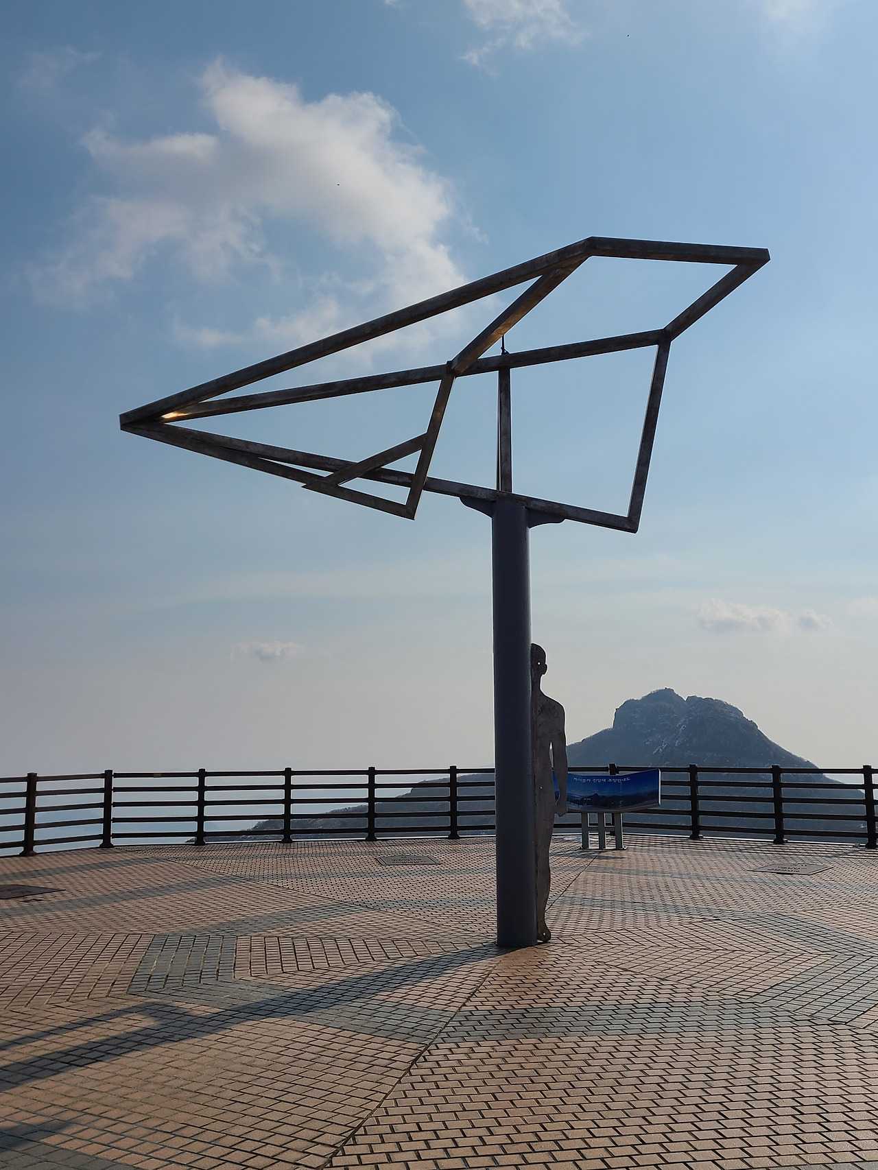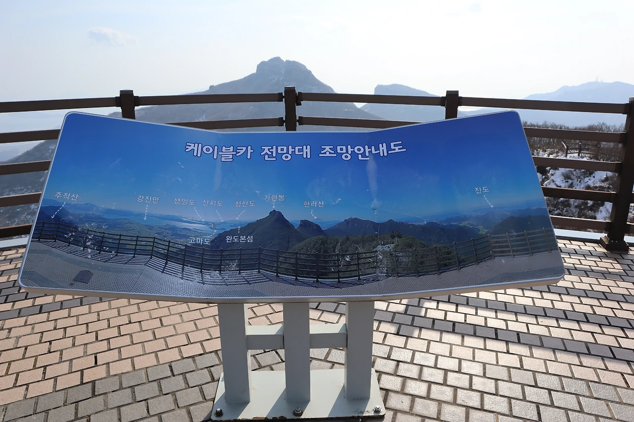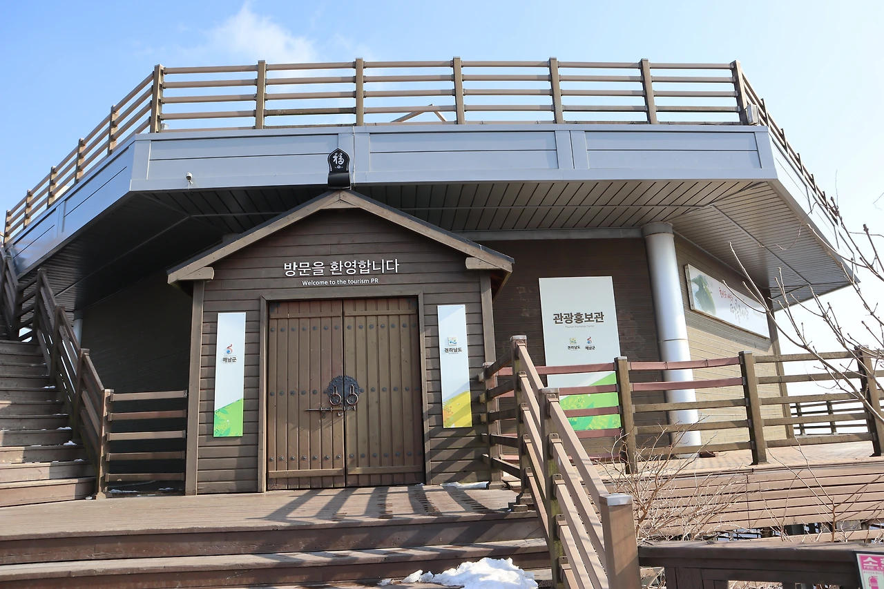 영암 월출산, 강진 주작산, 광주 무등산이 보인다고 하지만 미세먼지와 황사로 가득한 날씨 눈부시다는 다도해 아슴하고, 주작산만이 손 닿을 듯. 우문성 작가의 작품 ‘하늘, 바람, 사람’ 전망대 한가운데 우뚝. ‘관람객이 종이비행기의 반쪽날개가 되어 꿈을 향해 춤을 추듯 날아다니며 땅끝 하늘 에너지 가져가길’ 바라는 작가의 마음 담아있다.