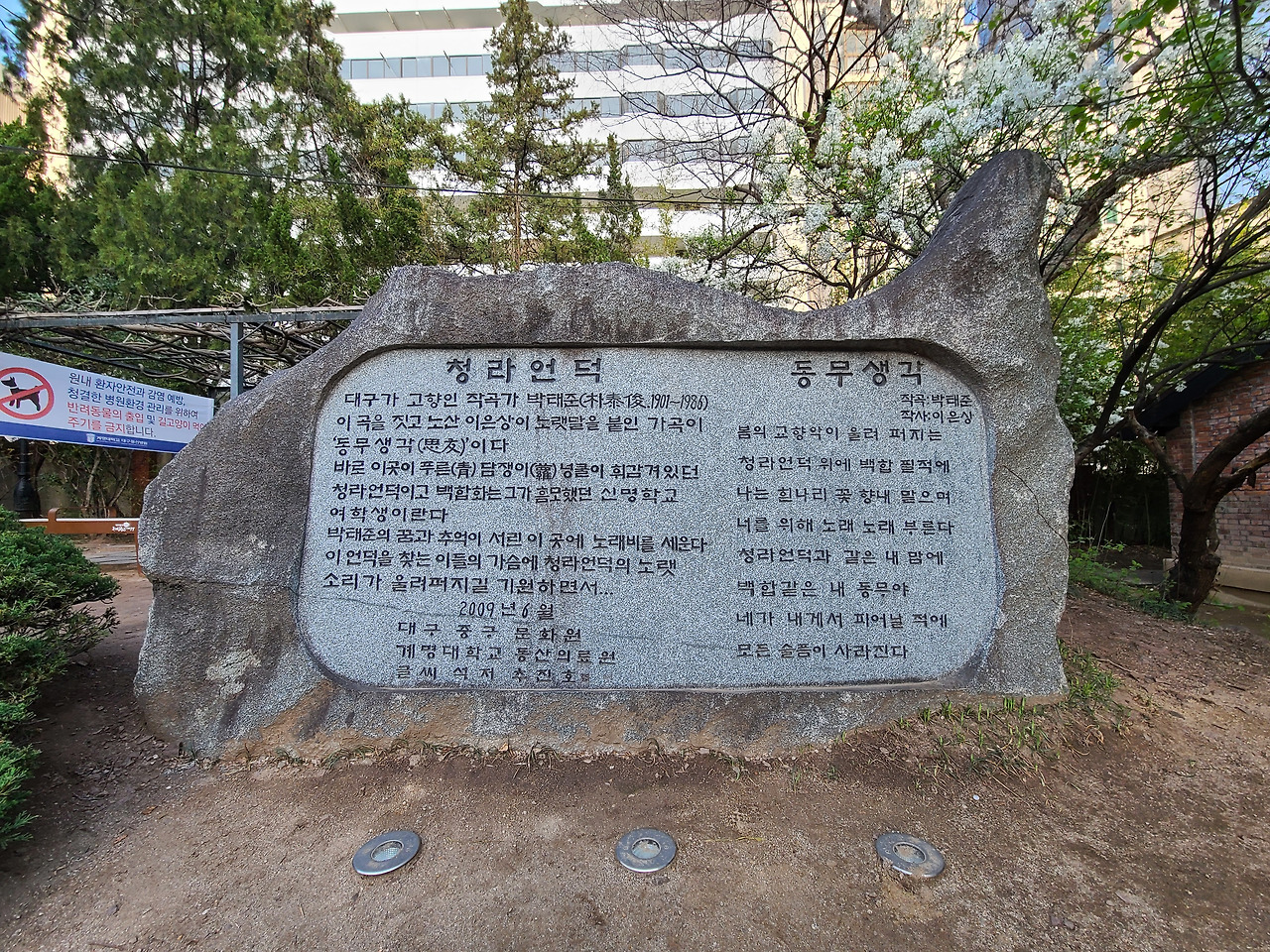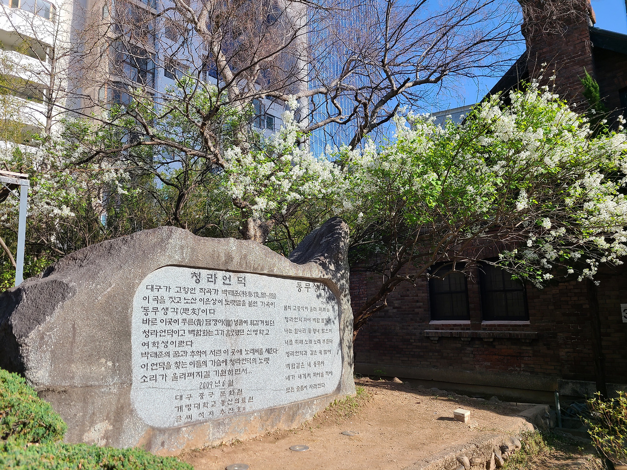 1899년 기독교 선교사들이 거주하면서 담쟁이를 많이 심은 데서 유래되었다는 청라언덕 오른다. 저물녘이면 남편의 보고픔이 수국처럼 부풀어 올라 더 진저리 쳐지는 그리움이 있다고 말하던 푸르던 날의 그 애. 지금도 둥실 떠오르는 달처럼 남편을 향한 그 마음 담쟁이넝쿨 벽을 타고 오르고 있을 그 애를 생각하며 ‘동무생각’ 노래비까지 왔다.
