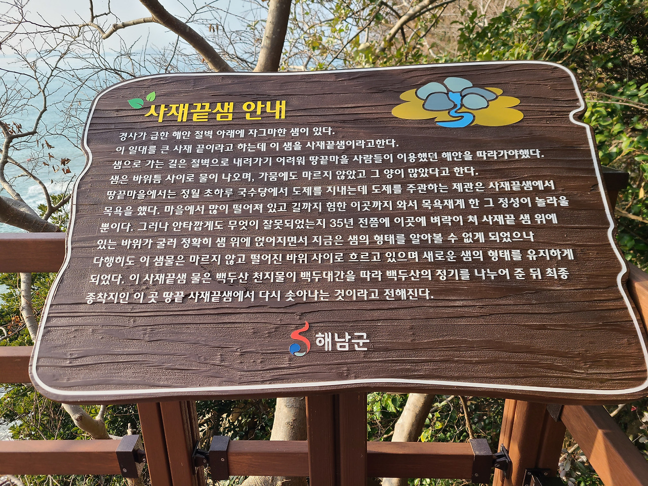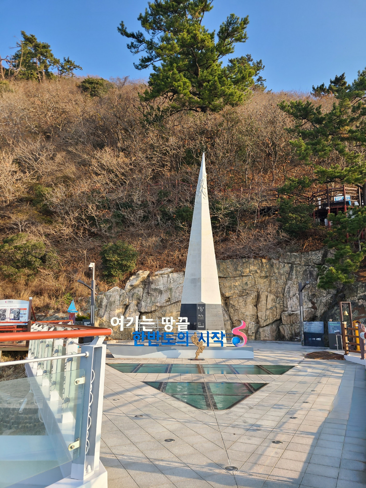따뜻한 지역이라 하지만 겨울 새벽은 춥다. 이른 시간 근처 편의점만이 오픈이다. 새벽 추위를 녹이는 커피 한 잔과 빵으로 아침을 해결하고 땅끝 탑 잔도길 걷는다. 해는 제법 많이 올라와 바다에 빛나고 우리의 말들은 데크 길로 굴러간다. 제 작년에는 산길 작년에는 공사 중이었던 잔도길이 환하고 편하게 우리를 안내한다. 혼자 일몰 감상 후 돌아오는 산길 무서워 달리던 중 분홍 스카프 하나 바람에 날린 지금은 폐쇄된 곳 아련하게 바라본다.