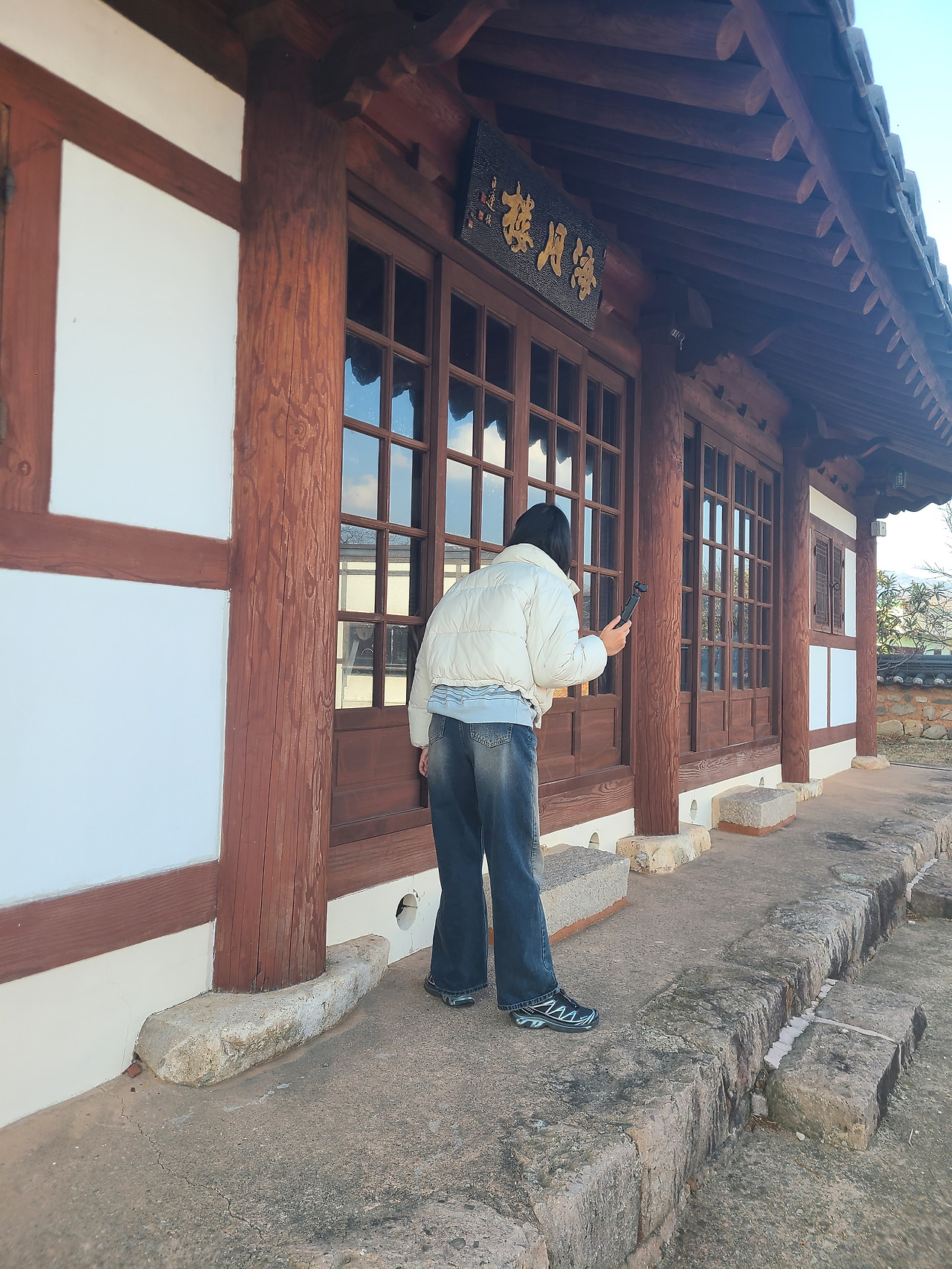 해월루 누각에서 바다를 감상하는 인하시인과 누각 안이 궁금증을 풀고 있는 피디의 모습이 더 궁금한 나는 기념사진 한 컷.