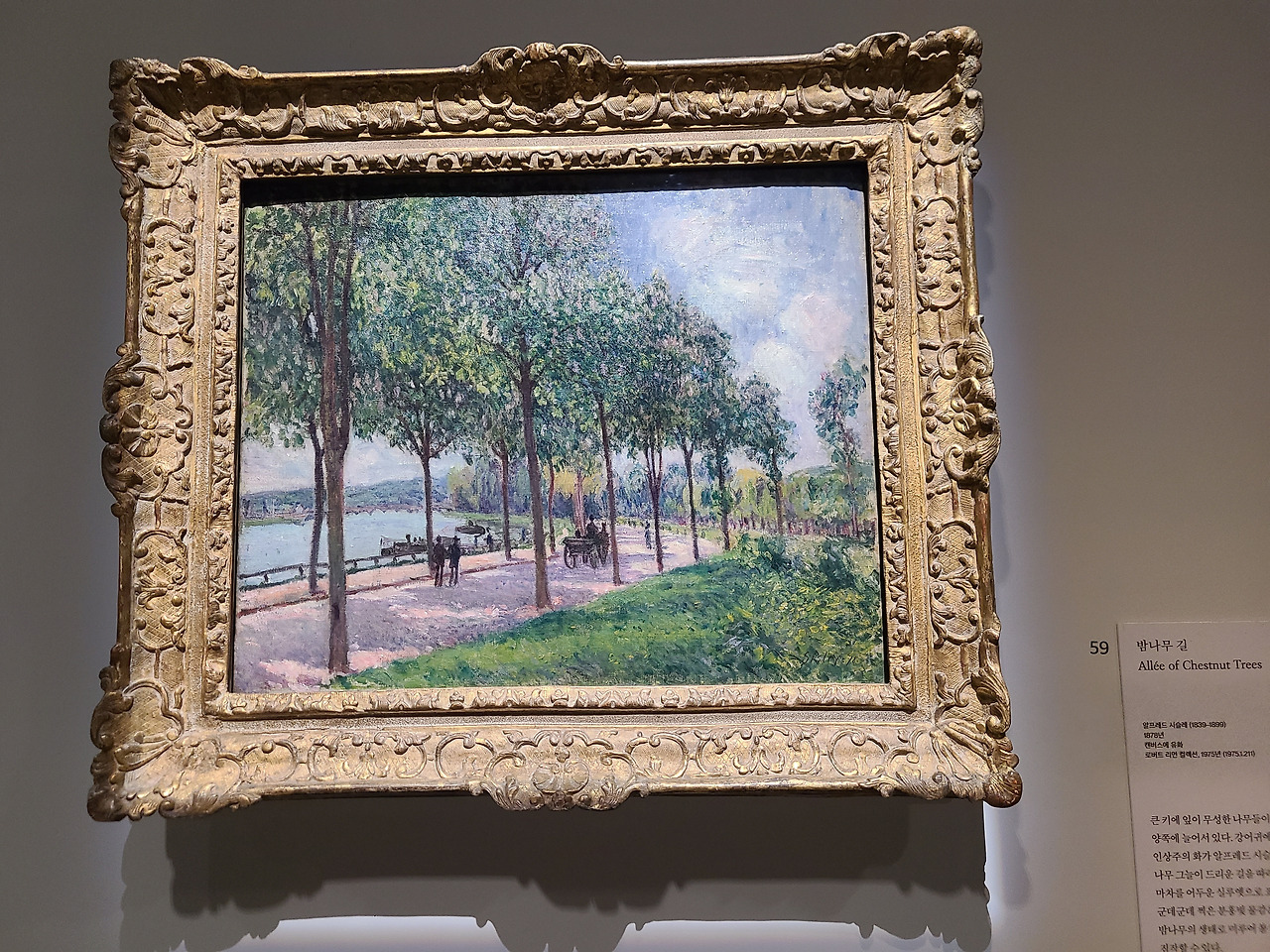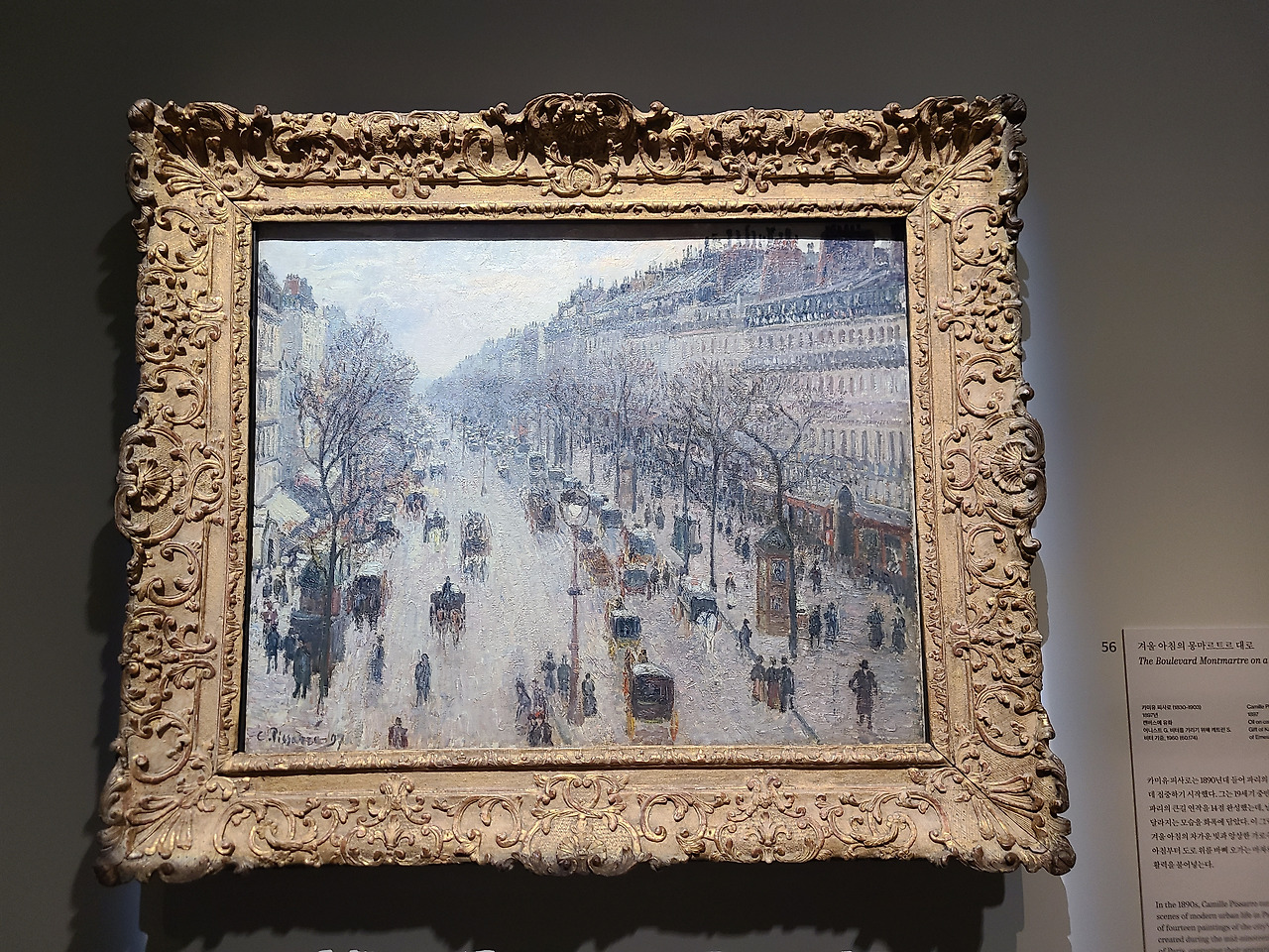 푸름이 던진 빛의 작품들 속에서 회색 도시에 비친 빛은 또 다른 깊이를 준다. 알프레드 시슬레의 ‘모레의 외젠 무수아르 거리의 겨울풍경’은 잔설이 남아있는 국립중앙박물관 나무그늘 풍경과 대비되며 차가운 공기를 순간의 빛으로 승화시켜 따뜻함으로 승화시킨 듯 가깝게 다가온다. 카미유 파사로 ‘몽마르트르 대로 봄 아침’은 암울하면서도 활기 넘치는 분위기에 나도 그 거리를 걸어보고 싶다는 생각이 미치는 순간이다.