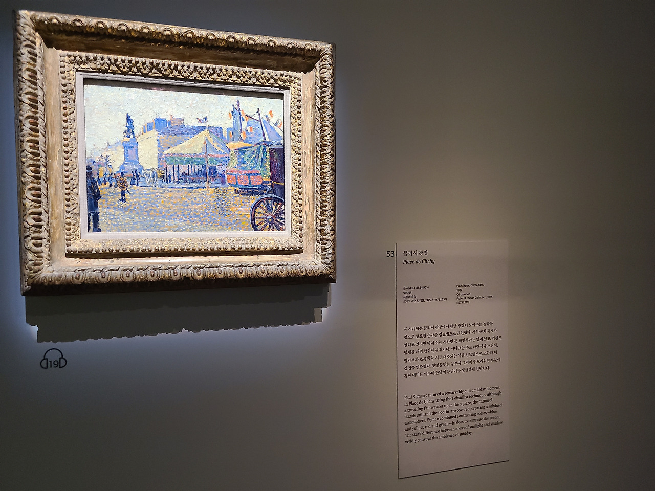 즉흥적인 붓 터치 대신 원색의 점과 점으로 그림을 그려 점묘법을 탄생시킨 조르주 쇠라의 ‘그랑드 자트섬의 일요일 오후’ 작품 앞에서 마음이 멈춘다. 수많은 미세한 점들이 서로의 빛을 내고 있는 경이로움은 과학에서 찾아 예술에 녹여낸 화가이며 쇠라가 남긴 점묘법은 오늘날 디지털 TV에서 사용되는 픽셀 개념으로 응용되고 있다고 하니 우리들 생활 속에 숨 쉬고 있는 조르주 쇠라인 듯. 빛과 그림자를 대비시키며 한낮의 분위기를 보여준 폴 시나크의 ‘클리시 광장’ 작품도 쇠라를 연상시킨 점묘법 작품 또한 인상적이다.