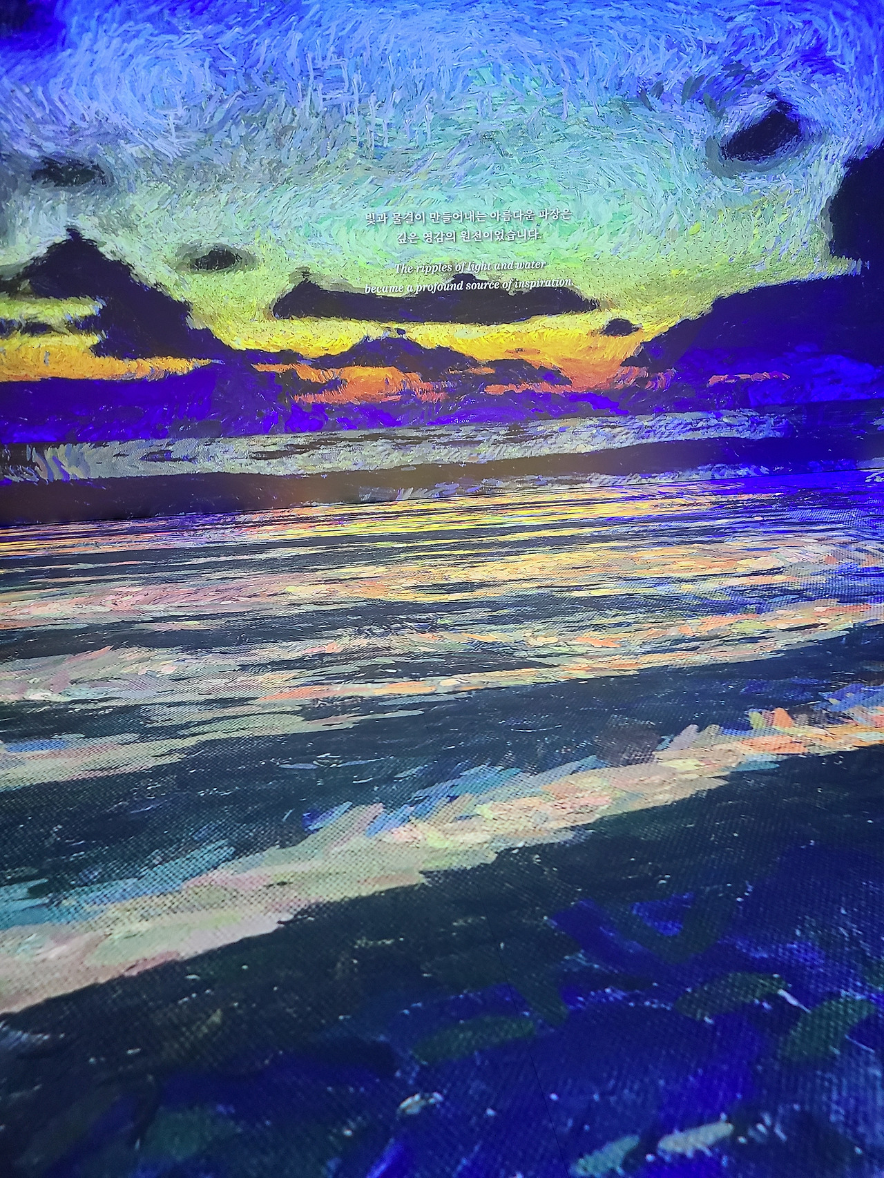 르누아르 ‘해변의 여인들’ 물의 빛은 얼마 전 제주도 여행 시 우도 서빈 백사의 그 물빛과 흡사하다는 착각과 피에르 보나르 ‘오래된 항구 생트로페의 풍경’은 심해 깊숙이 빨려드는 지중해의 빛과 다음 영상으로 이어지면서 물결치는 해변에 앉아 있는 착각을 일으킨다.