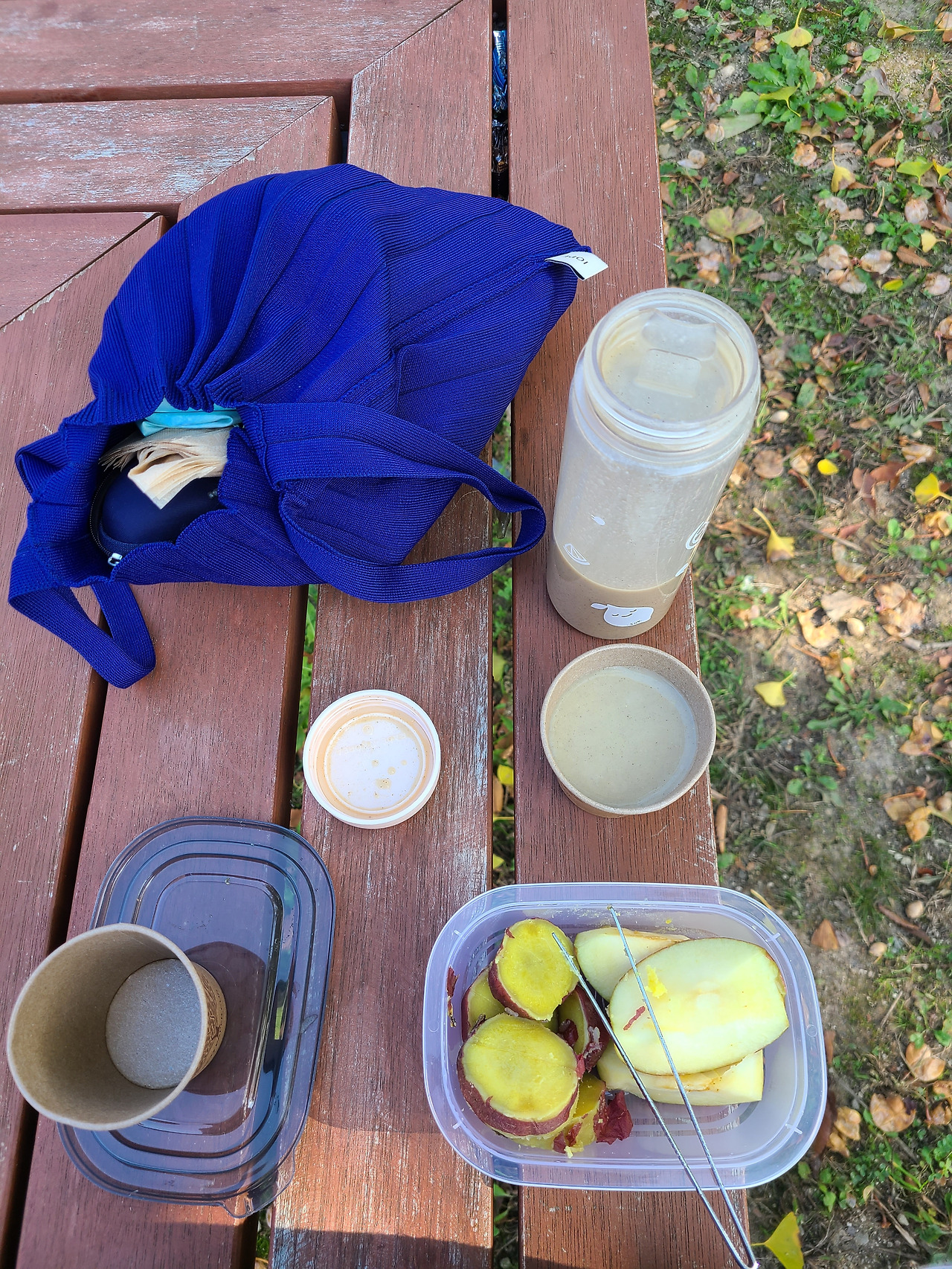 은행나무 아래서 청승 아닌 낭만 암튼 고구마 도시락으로 가을을 먹고 있다. 내가 너를 네가 나를 바라본다는 건 서로 어떤 기분일까. 한참을 그렇게 고구마에 가을 풍경을 버무리고 이서유 작가가 선물로 준 바다 빛 에코백 나무에 걸어놓고 기념사진 남기며 그림자 하나 없는 입구를 나온다.