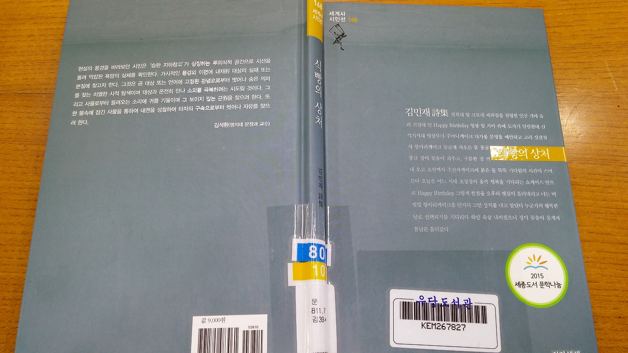 이건 다 비 너 때문이야 혼자 중얼거리며 800번 문학 코너. 익숙하면서도 어색하고 멋쩍은 김민재 내 이름이 있다. 세종 도서 문학 나눔 시집 「식빵의 상처」 여기에서 만나다니. 많이 반가웠다. 그렇게 오전 내내 도서관에서 문장의 숲을 헤맸다. 다정한 말들 밑줄 그을 수 없어 문장 옆에 마음의 세 잎 클로버 그려놓고, 다소 무거운 행간은 지나쳐 오지 않는 곳으로 지나갔다.
