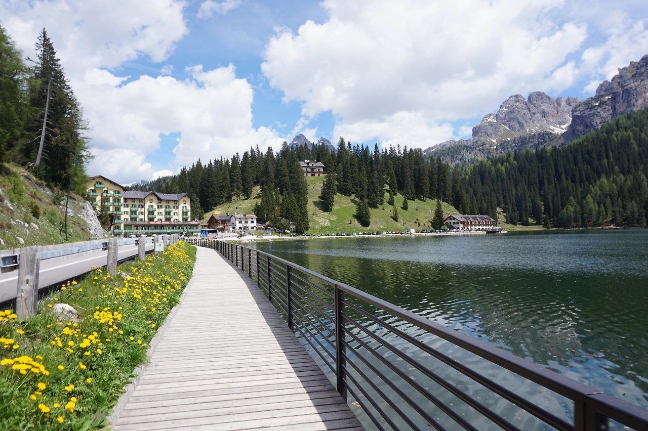 늙은 왕의 슬픈 눈물로 만들어진 미주리나 호수는 거대한 암봉들이 반영되어 고혹적인 곳. 노란 야생화 어우러진 데크를 지나 점심 먹으러 돌로미테에서 가장 맛있다는 피자집 간다. 피자 맛 그냥 짜다. 맛이라 것 주관적이기 때문에 누구에게는 맛 있는 피자일 수 있지만 내겐 그냥 짭조름한 피자일 뿐이다.