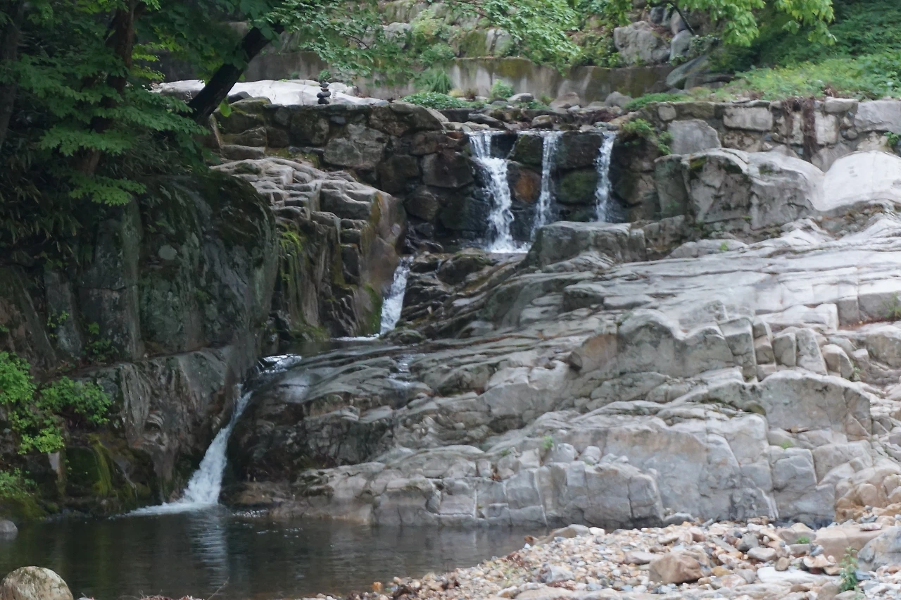 청운교에서 바라보는 계곡 삼단 폭포 물소리 모든 근심 걱정 끄집어내어 여기에 헹구어 흘러 보내고 가라 한다.