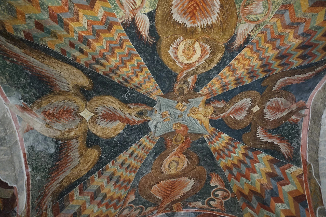 천정화의 프레스코 사자, 황소, 독수리, 인간 등 사복음서와 여섯 날개 천사 스라핌이 선명하게 우리를 반긴다.