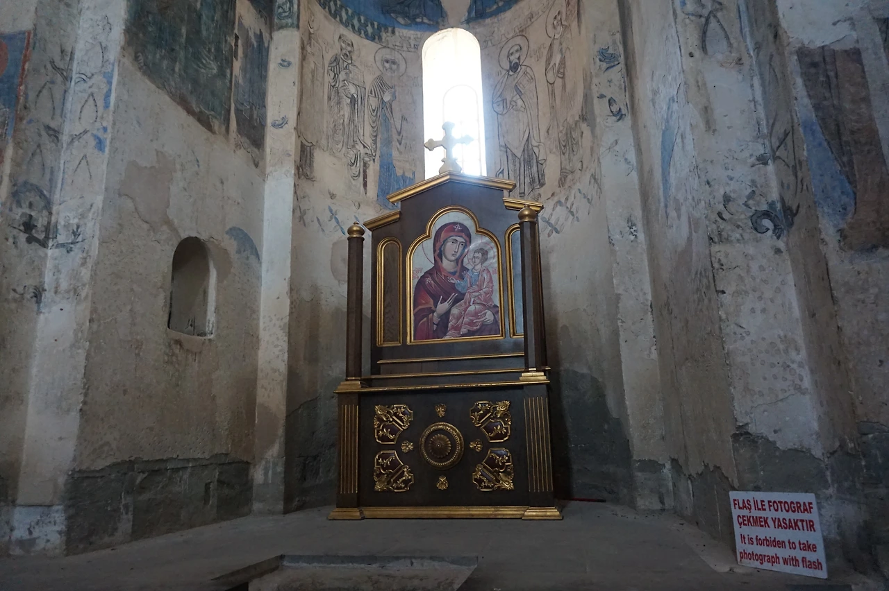 교회 외부 붉은 진흙 벽에 새겨진 양각 부조의 섬세함. 구약성서의 사건들이 햇빛을 받아 더욱 반짝이는 부조들이 금방이라도 튀어나올 듯하다. 성전에 들어갈 때 겸손히 몸을 낮추라는 뜻인지 유난히 낮은 출입문 들어서고 또 들어서니 채색 벽화 신약성서는 지워지고 벗겨지고, 성전 한가운데 아기 예수를 안은 성모 마리아 프레스코화가 고운 자태로 눈 맞춘다.
