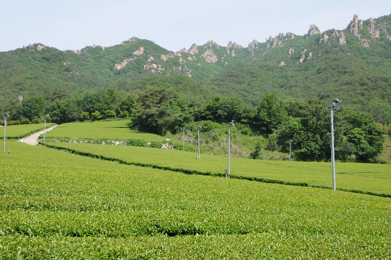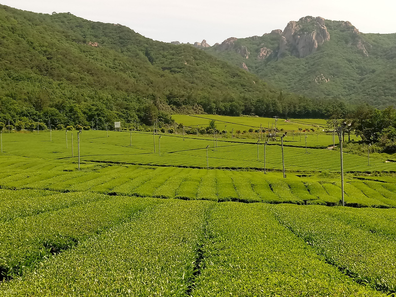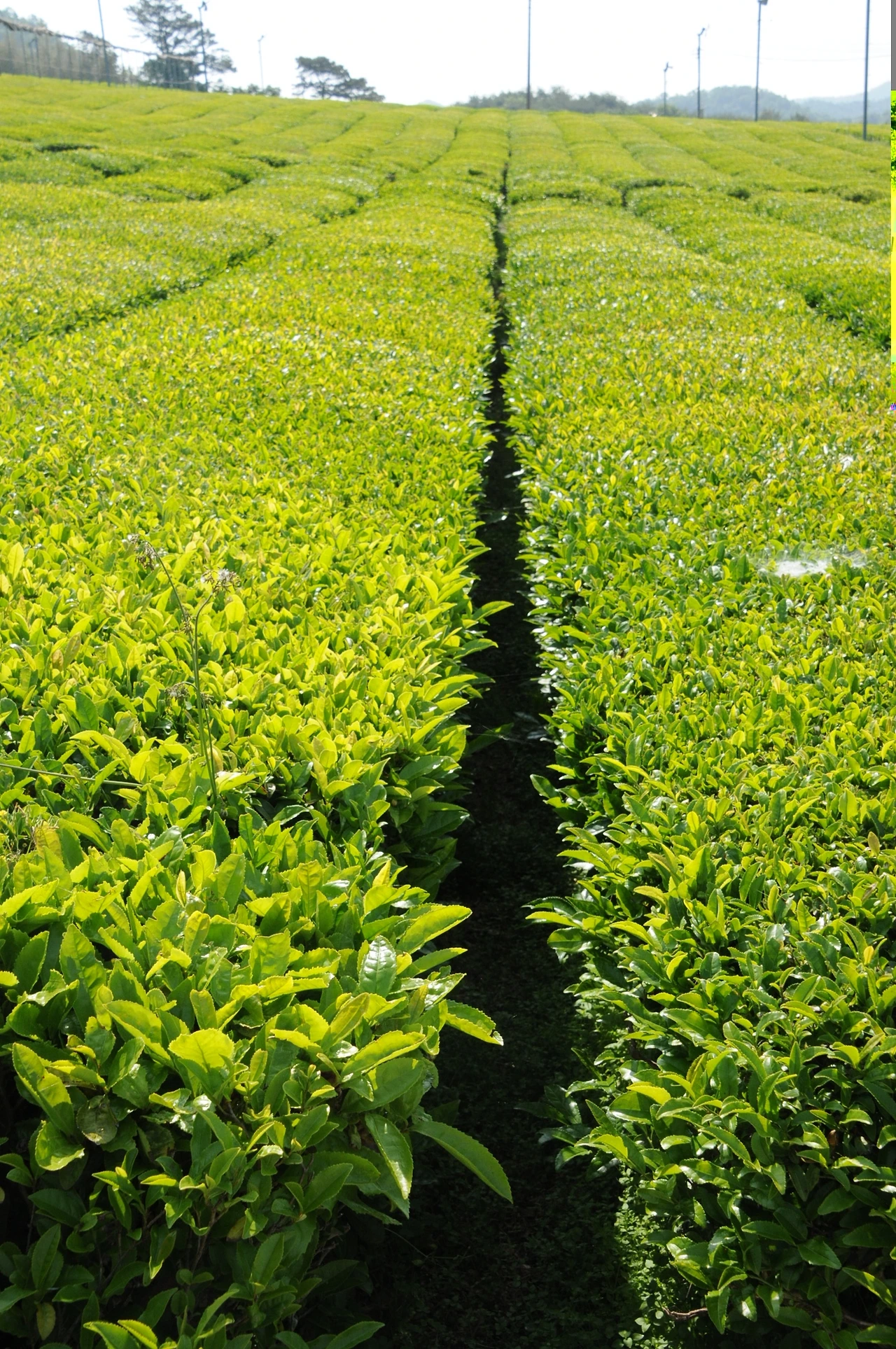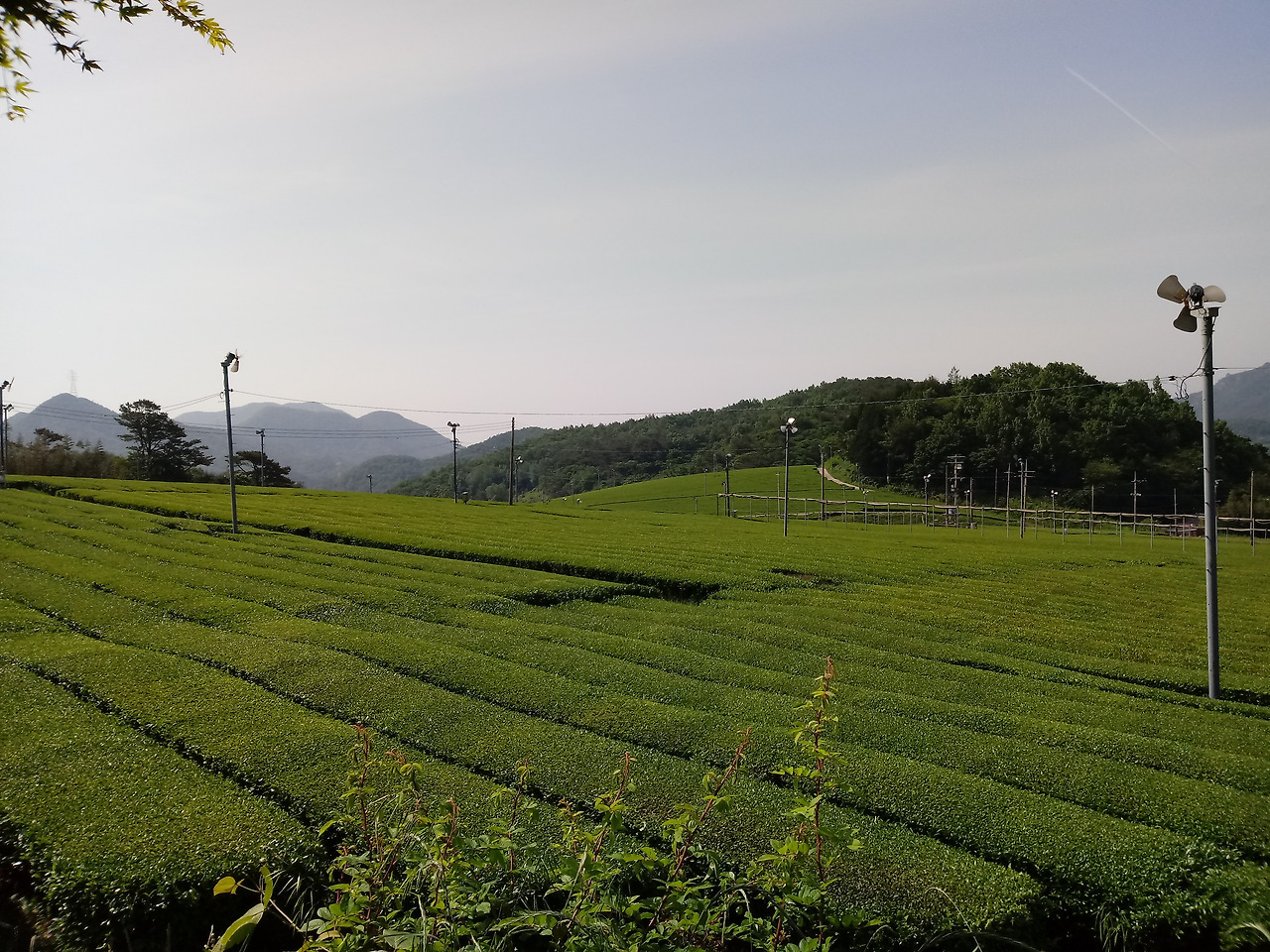 지표면의 온도가 내려가면 자동으로 방상 팬이 위쪽의 따뜻한 공기를 차밭으로 불어 녹차의 새순이 찬 공기가 머물지 못하도록 설치된 구조물. 방상 팬은 차밭 군데군데 또 다른 풍경을 이루고 있다. 바람개비처럼.