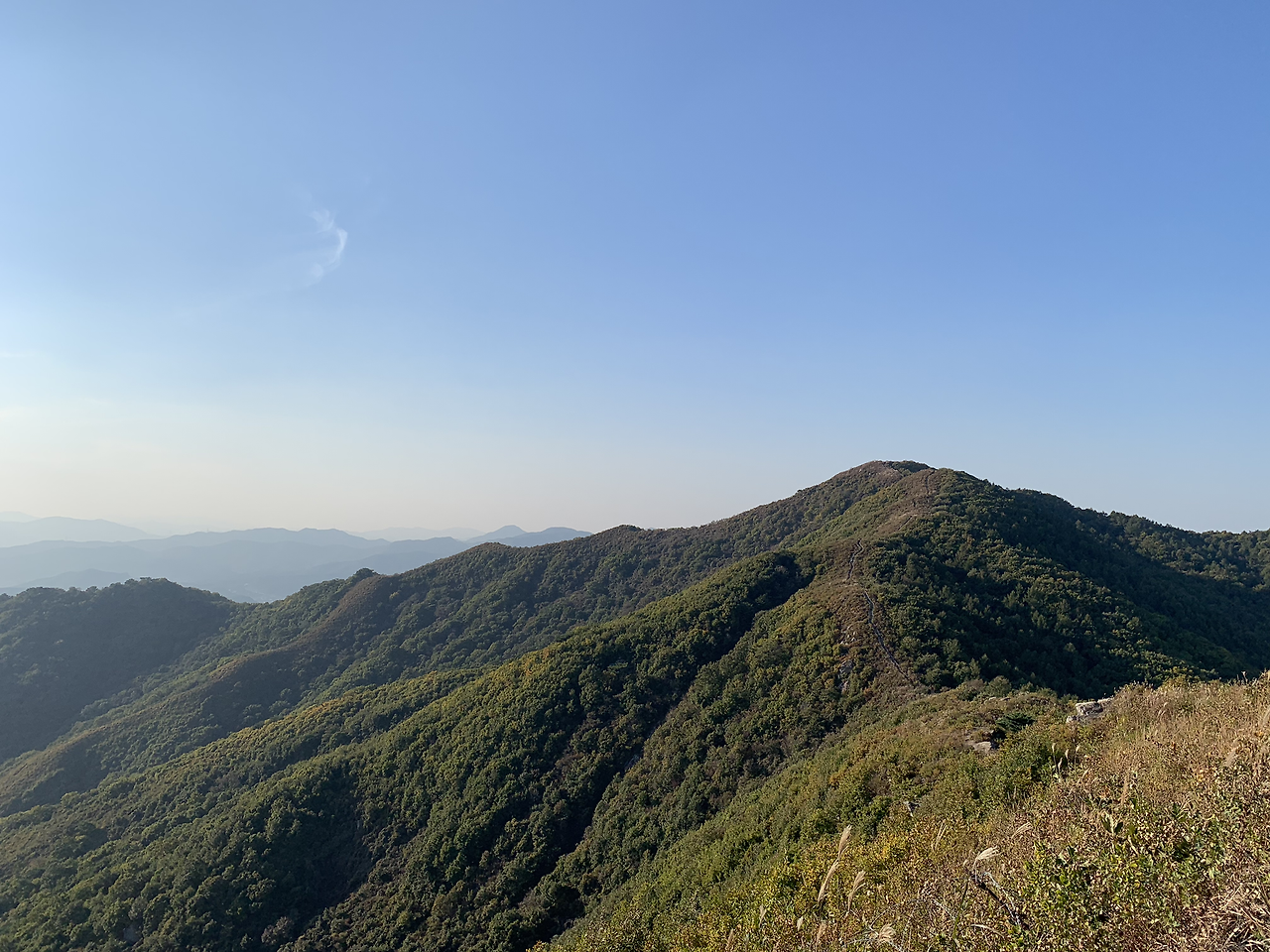 원적봉에서 고개를 돌려 오른쪽으로 바라보니 멀리 천덕봉이 보였다. 여기 원적봉에서 천덕봉까지 이어지는 능선길이 아늑하고 따뜻하게 느껴졌다. 살랑이는 바람을 맞으며 가볍게 저 길을 걸으면 좋겠다 싶다가도 오늘 우리의 여정은 멈추기로 했다. 초보 백패커에겐 한 발짝도 더 나가기 어려울 정도로 지칠 때가 좀 빨리 오는 것 같다. 올라오면서 땀을 많이 흘렸으니 바람막이 점퍼를 꺼내 입고 해가 지는 것을 바라보기로 했다.