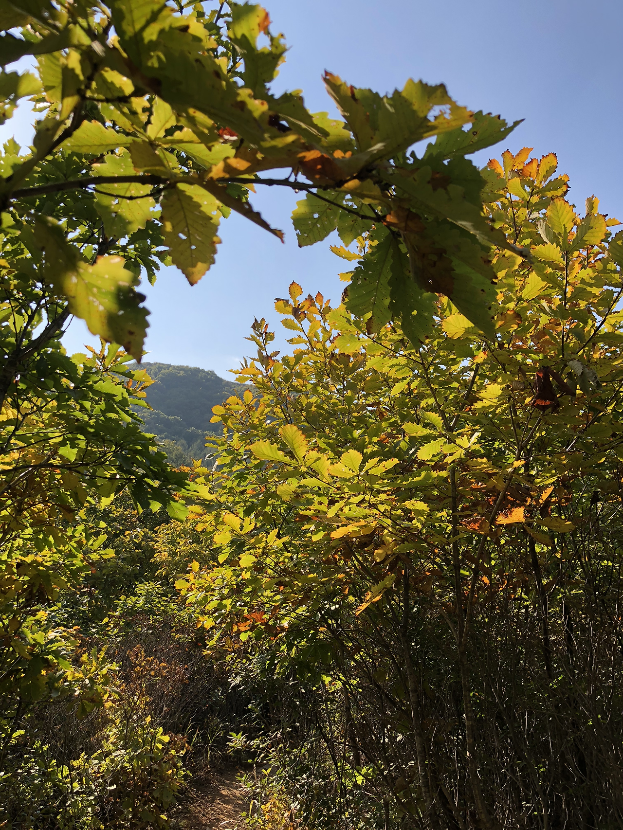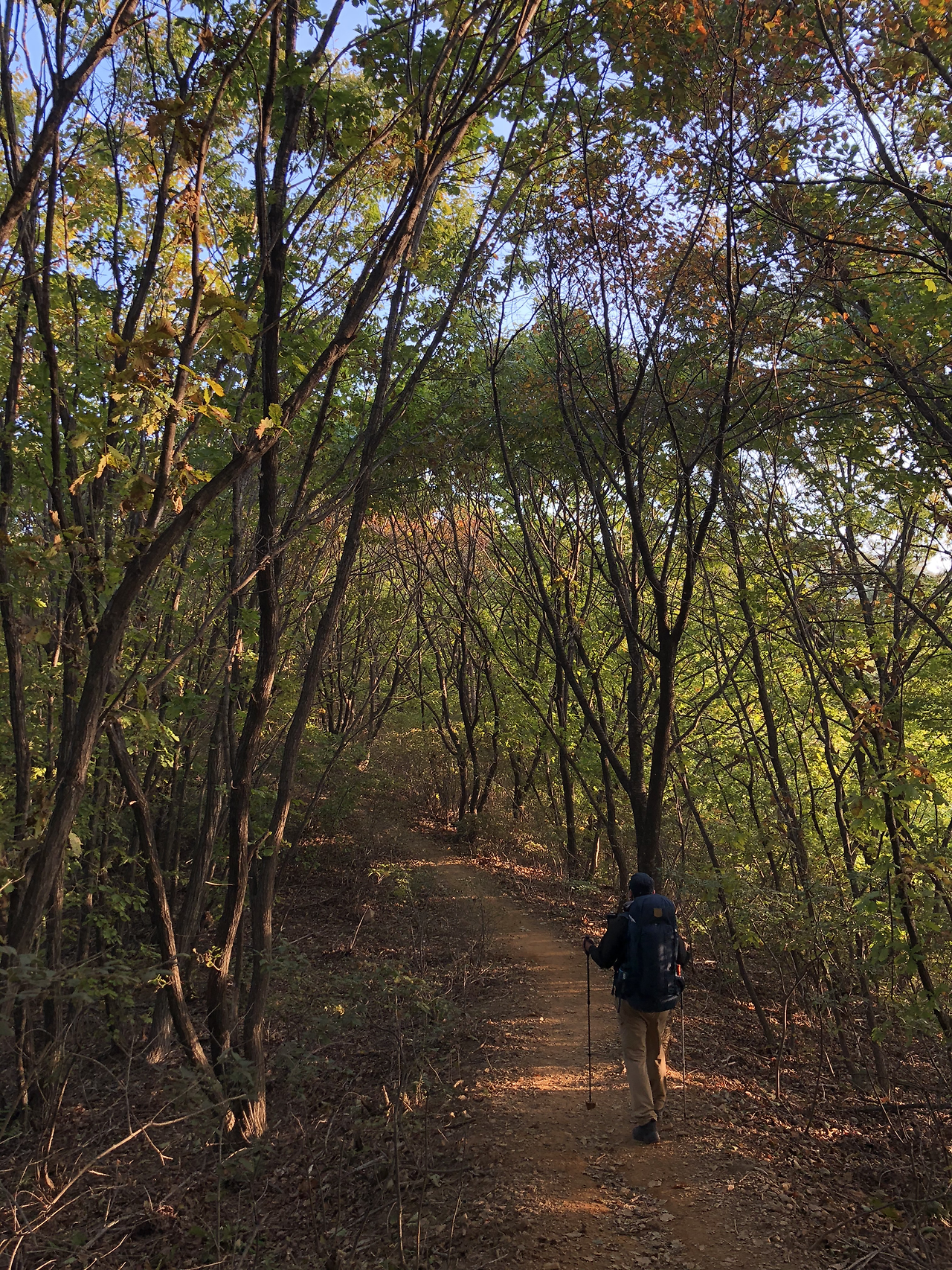 등산 코스는 원적산이 품고 있는 천년고찰인 영원사에서부터 원적봉까지 오르기로 하고 여력이 되면 주봉인 천덕봉까지 가기로 했다. 한발 한발 정상을 향해 걷다 보니 나무들의 가을 채비를 만날 수 있었다. 산 아래는 아직 푸르기만 한데 산의 나뭇잎들은 어느새 다채로워지기 시작했구나. 등산길에서 풍겨오는 가을 향기가 참 좋았다.