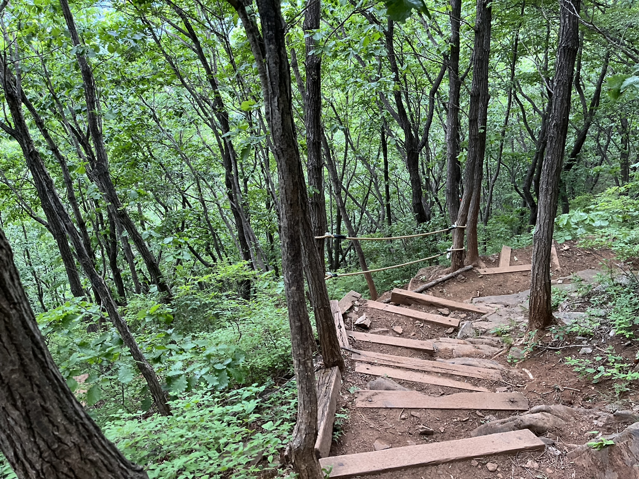 오르막길이 이어지다가 산길 중간에 휴게소가 있었다. 휴게소는 굳게 닫혀있었지만 근방에 빈 벤치가 무척이나 반가웠다. 나는 가방이며 스틱을 아무렇게나 내려놓고는 몇 분간은 가만히 누워서 하늘만 올려다보았다. 오늘 비가 내릴까? 흐린 하늘은 구름 몇 점을 땅 가까이 내려다 놓고 있었다. 이날은 종일 약한 비 예보가 있던 날이었다. 산행 중 비를 만나면 맞아야지 하는 마음으로 등산을 시작했지만 다행히 비는 내리지 않았다. 다만 공기 중 수분이 넘쳐흘러 나무와 흙냄새를 진하게 만들어주었다. 빽빽이 숲을 채운 나무들 사이로 올라오는 향기는 백팩을 지고 오르는 힘든 산행의 이유가 되어주는 것 같다.