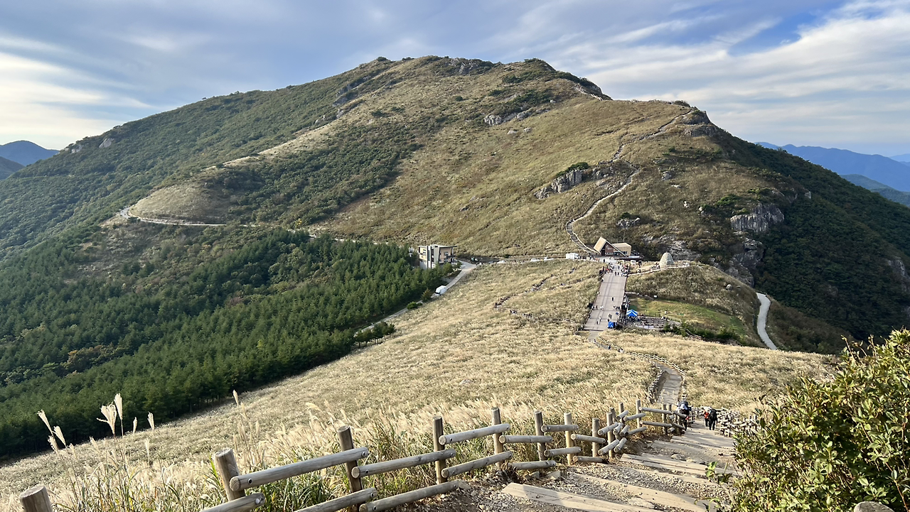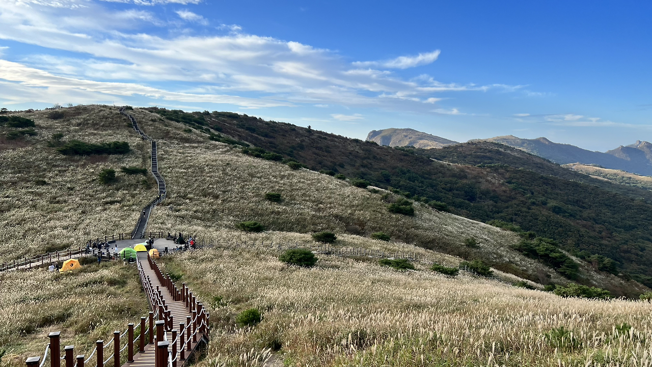 여기가 바로 간월재. 말로만 듣던 간월재는 등산길과 임도를 따라 두 시간쯤 걷다 보니 보이기 시작했다. 해발 900미터의 드넓은 평원에 펼쳐진 억새가 시원하게 바람에 흔들리는 모습에 마음이 두근두근 거린다. 간월재 너른 데크에는 억새를 보는 사람들과 사진 찍는 사람들, 간식을 먹는 사람들로 북적였다. 모두가 행복해하는 모습 또한 하나의 풍경처럼 편안해 보였다. 우리도 휴게소에서 컵라면을 사서 늦은 점심을 먹었다. 산에서 먹는 컵라면은 꿀맛이구나!