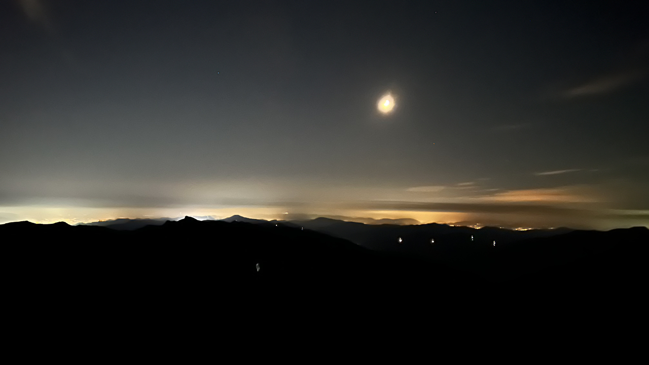 저녁을 먹는 동안 하늘은 이미 어두워지고 하늘의 달이 밝게 떠올랐다. 달빛에 산 능선이 희미하게 빛나는 모습을 바라보며 차를 우리기로 했다. 산에서 화기를 사용하지 않기 때문에 따뜻한 차가 아닌 냉침으로. 마른 찻잎이 부드럽게 풀어지고 연한 푸른빛이 감돌 때까지 기다리며 밤의 풍경을 바라보니 조용한 이 시간이 참 좋다. 이제 수많은 별을 만나 아득함을 느끼며 잠들 차례다. 텐트를 나와 주변을 둘러보니 하늘에서 많은 별들이 조용한 바람에 흔들리고 있었다. 산 그림자 사이에도 희미하고 작은 텐트 빛들이 반짝였다. 우리도 멀리서 보면 작고 여린 빛으로 보이겠지.