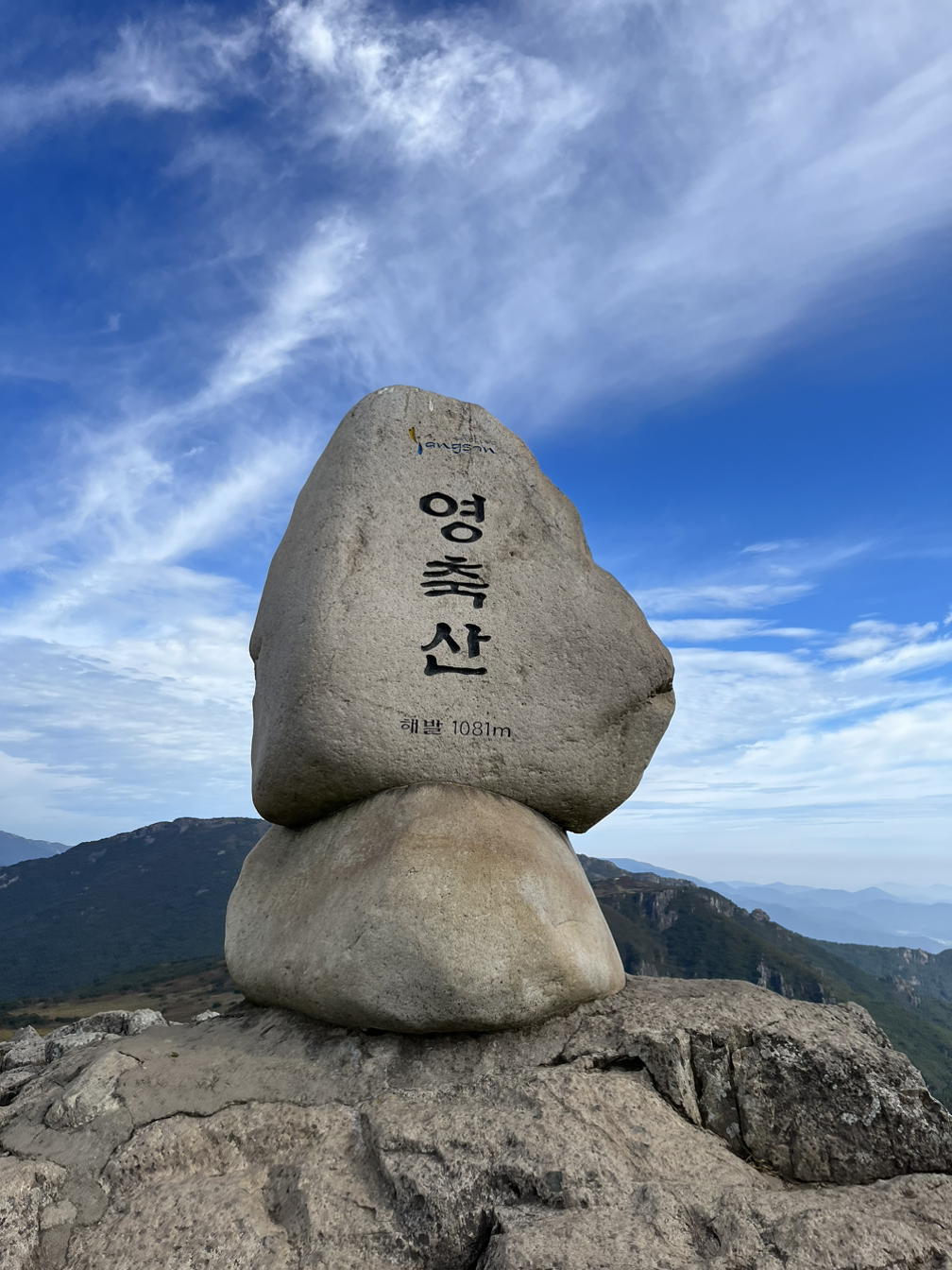 신불재에서 한 시간 가량 걸었을까. 하늘 억새길을 따라 걷다 보니 어느새 영축산 정상에 이르렀다. 영축산은 정상의 바위가 꼭 독수리 부리처럼 생겨 유래한 지명인 취서산이라고도 불린다고 한다. 그 이야기를 듣고 바위를 바라보니 고원 위에 우뚝 솟은 바위가 파란 하늘 아래 날개를 펴고 날아오를 듯 강렬한 독수리의 부리 같아 보였다. 아래를 내려다보니 우리가 걸어온 길이 저 아래 보였다. 걸어올 때는 꽤나 숨이 차고 힘들었는데 돌아보니 그 길이 짧아 보이는 것은 왜일까. 잠시 에너지바와 물을 마시며 영축산 정상에서 보이는 풍경을 마음에 담는다.