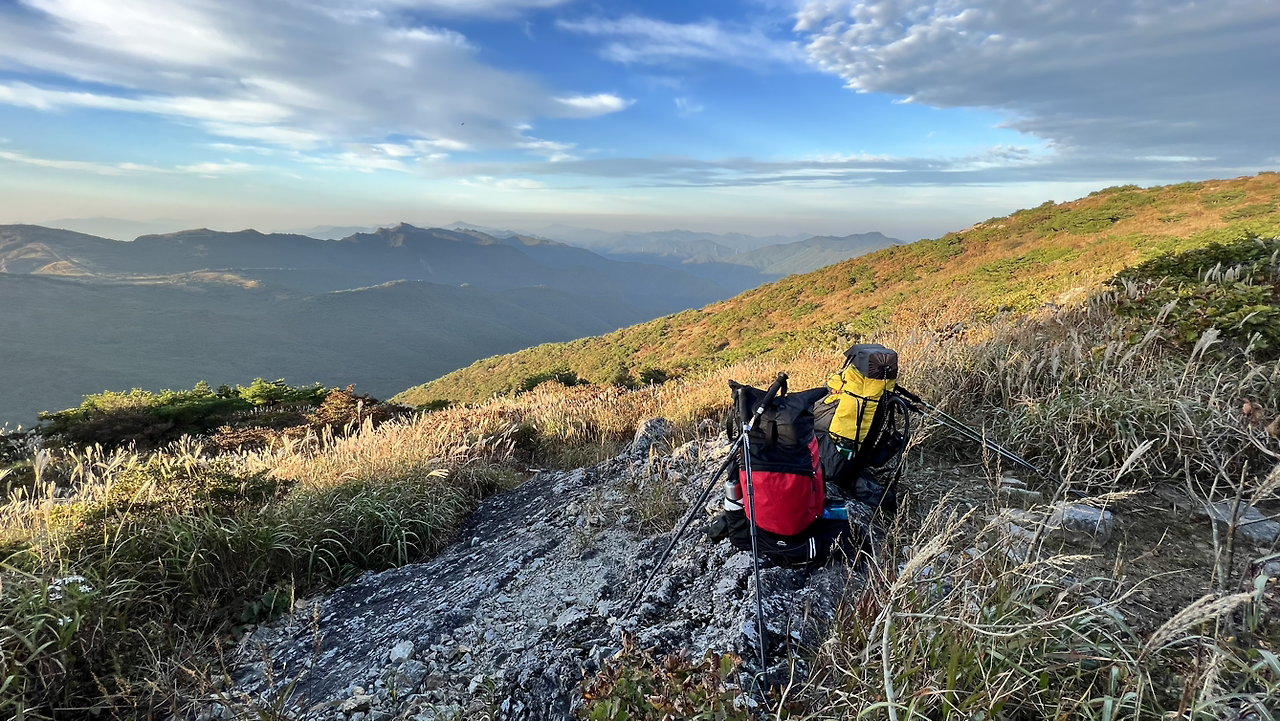 그렇게 풍경에 반해 걷다 보니 어느새 해가 산 능선을 넘어갈 채비를 하고 있었다. 신불재까지는 한 시간 정도 더 걸어야 했기에 해가 지기 전에 마땅한 곳을 찾아 텐트를 치기로 했다.
