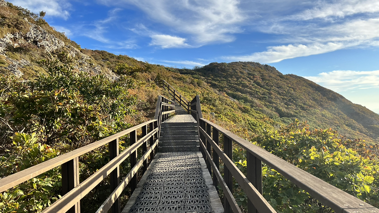 간월재에서 시간을 보내고 나니 해가 많이 기울어 있었다. 우리는 신불재를 박지로 생각하고 있었기에 다시 가방을 메고 스틱을 쥐었다. 간월재에서 신불산 가는 길에 촘촘하게 박힌 수많은 계단을 올라가다 보니 제법 평평한 계단길이 나타났다. 가뿐 숨을 몰아쉬며 둘러보니 사방 트인 능선 사이로 파란 하늘과 단풍을 입기 시작한 나뭇잎들이 반짝거리고 있었다. 심장은 마구 뛰고 땀은 흐르는데 멋진 풍광에 반해 힘든 것도 잊고 말았다.