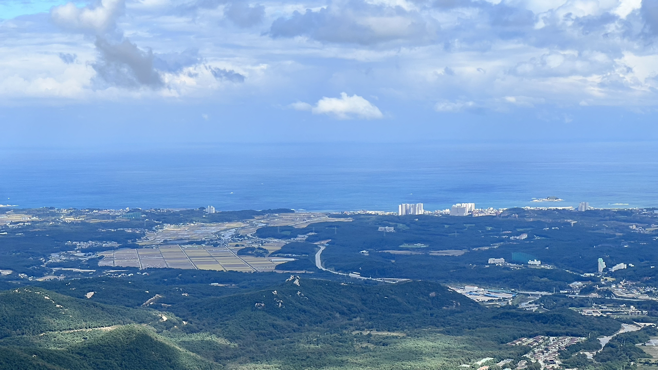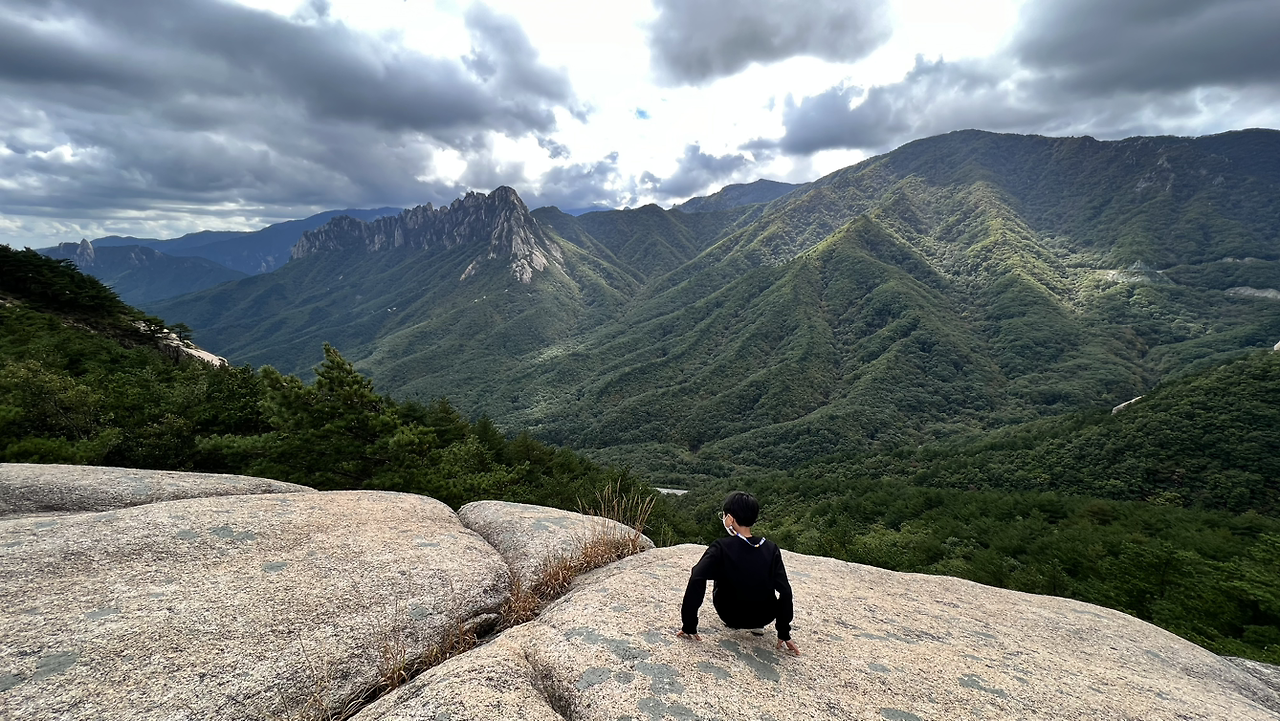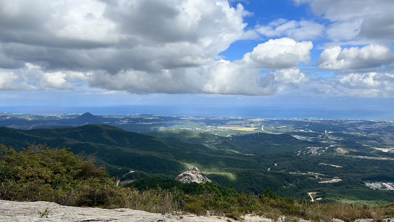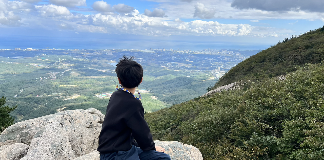아이는 성인대 바위에 앉아 동해를 내려다보며 감탄하기 시작했다. 다행히 맑은 날이어서 낮은 산들과 멀리 푸른 바다, 건물들이 한눈에 내려다보였다. 마침 가을의 시원한 바람이 불어와 흘린 땀을 데리고 가주고 우리에겐 풍경에 대한 감탄과 감사만이 남았다. 저마다 사진을 찍으며 순간을 담는 사람들 사이에서 뭔가 뿌듯함을 느낀 아이는 한동안 풍경을 바라본다.