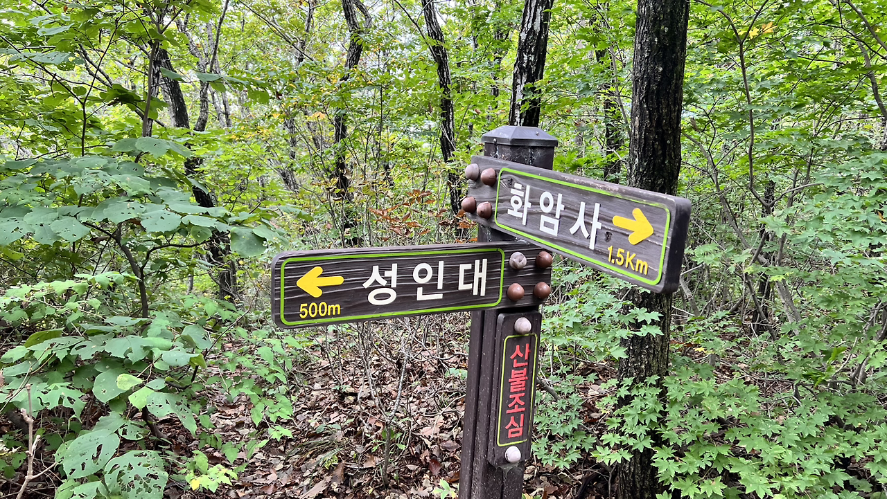 이런저런 이야기를 나누다 보니 드디어 이정표가 보인다. 성인대까지 500m만 가면 되겠구나. 다들 힘내자. 오르막길이 한동안 이어졌지만 여기서부터 성인대까지는 부담되지 않는 숲길이 펼쳐졌다. 상쾌한 숲의 향기를 맡으며 사부작사부작 걷다 보니 어느새 사람들의 감탄하는 목소리가 산 위에서 들리기 시작했다. 어딘지는 정확히 모르겠지만 흥분한 사람들의 목소리에서 거의 다 왔음을 느꼈다.
