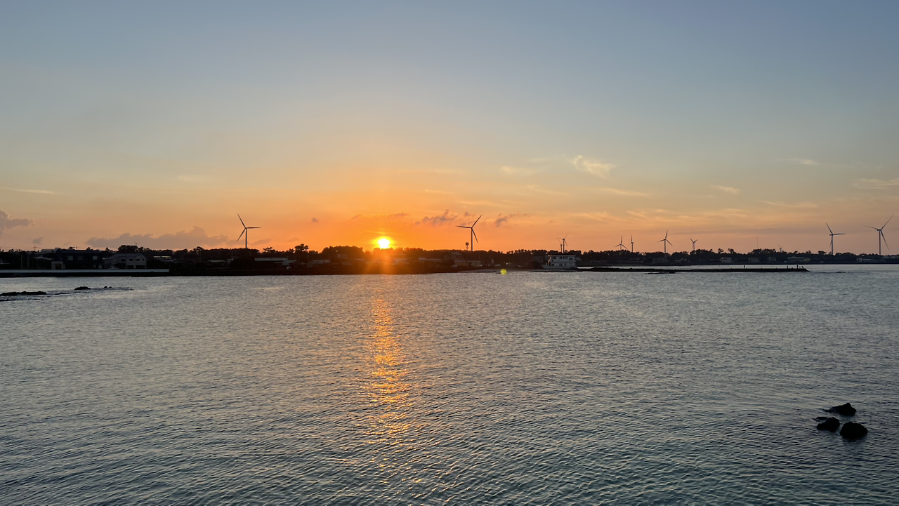 제주에서는 어디 건 오가는 길에 항상 바다가 있었으므로 자전거를 타고 향하는 곳은 결국 아름다운 바다일 수밖에 없었다. 하루는 저녁을 먹고 돌아가는데 아름다운 노을을 만났다. 노을을 지나치지 말고 앉아서 그 순간 해가 넘어가는 것을 바라보고 싶었다. 자전거를 세워두고 해변을 따라 난 돌담길에 앉아 노을이 지는 하늘과 바다를 바라보는 일이 너무나 좋았다. 그 순간 마음에 어떤 평화가 깃들었다. 어떤 근심도 노을과 함께 사라지고 바닷물 소리, 바람 소리만 들려왔다. 아들도 그 풍경이 좋았는지 음악을 들으며 조용히 바다를 바라보기 시작했다.