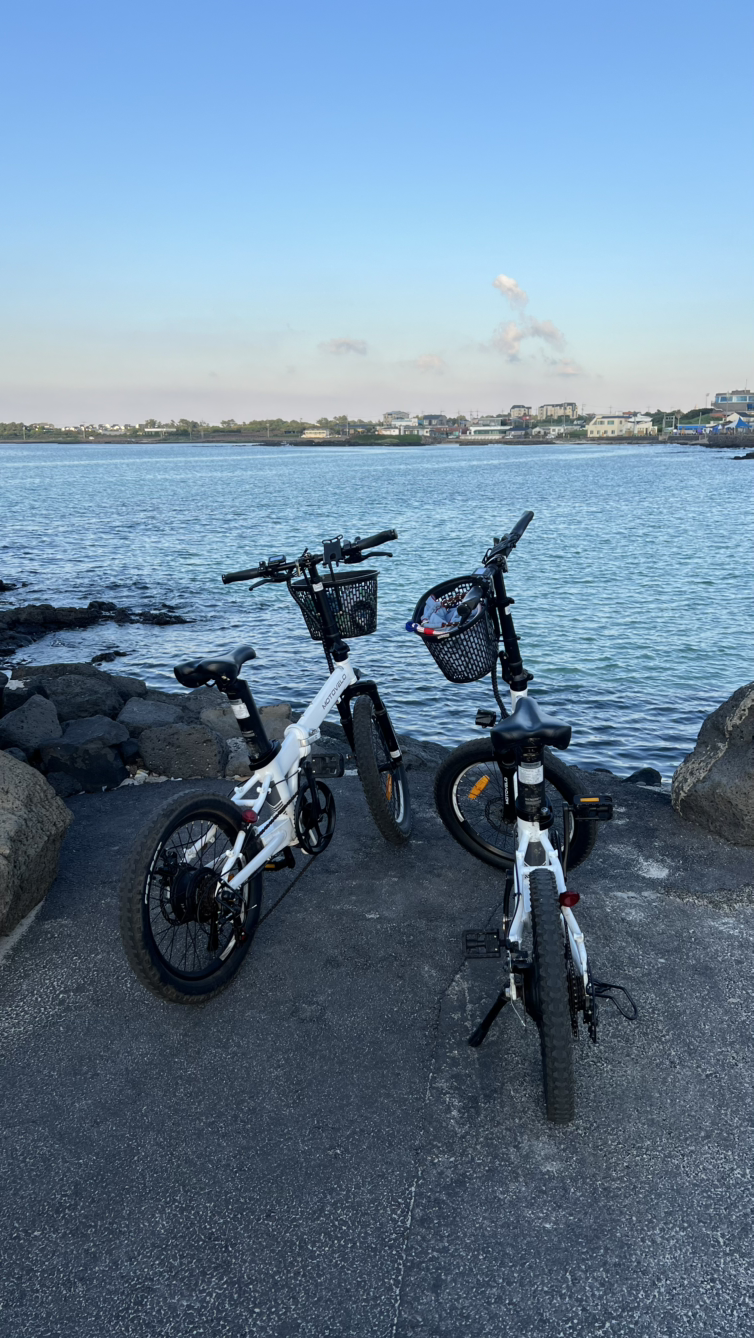 렌털샵은 평대리에서 세화로 넘어가는 해변가에 있었다. 작은 미니벨로 같은 자전거를 빌려야겠다 하고 샵에 들어갔는데 나의 생각과는 다르게 커다란 바구니가 달린 세월감 있는 것만 한 종류가 있었고, 나머지는 모두 전기 자전거였다. 미니 스쿠터도 몇 종 있었다. 아들은 이참에 전기 자전거를 타보고 싶다고 신이 나서 구경을 하기 시작했다. 그러고서는 이내 전기 자전거를 타자고 조르기 시작했다. 망설이고 있는 찰나에 사장님이 밖으로 전기자전거를 내가시며 한번 타보고 결정하라고 권유했다. 그럼 타보고 결정하자 싶어 전기 자전거에 올라봤는데 갑자기 뒤에서 누군가 힘차게 미는듯한 느낌이 나고 빠른 속도로 앞으로 가는 게 아닌가! 순간 겁이 덜컥 난 나는 브레이크를 잡으며 자전거에서 내렸고, 아들은 잠깐 타보더니 신이 나서 이거 빌리자고 한다.