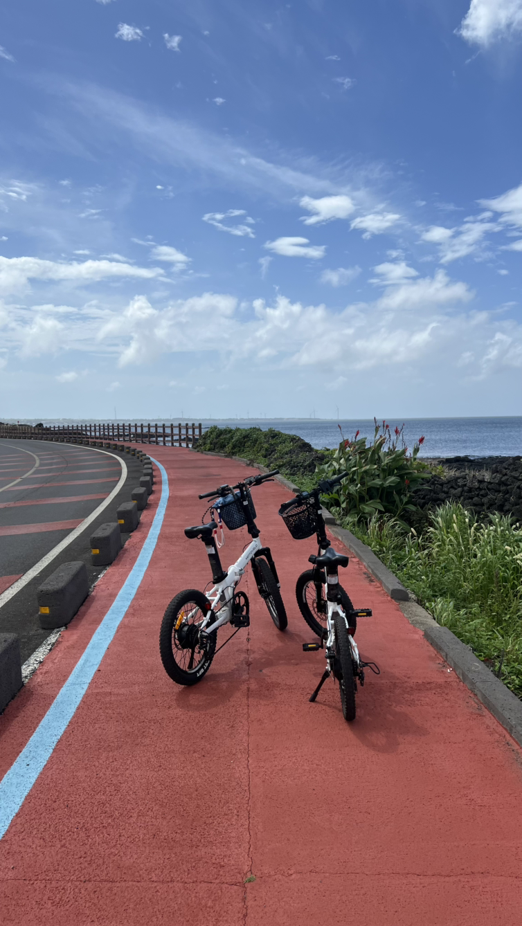 한 두 방울 내리는 비를 맞으며 달리다 보니 어느새 하늘은 개이고 제주의 아름다운 바다가 눈에 들어오기 시작했다. 신기한 게 처음에는 그렇게 무섭더니 타다 보니까 너무 재미있는 게 아닌가! 1단계부터 타다가 2단계로 올렸다가 3단계까지 속도를 올려가며 아들과 앞서가니 뒤서가니 하다 보니 어느새 하도리 지나고 성산 입구까지 갔다. 첫날인데 너무 멀리 왔나 싶어 자전거를 돌려 돌아가기로 했다. 전기 자전거가 익숙해지니 여유가 생겨서일까. 성산에서 세화로 돌아가는 길에는 바다가 눈에 더 잘 들어왔다. 파란 하늘과 바다를 따라 난 자전거길에는 우리만 있었다. 여유가 생긴 뒤로는 아들을 앞으로 보내고 달렸다. 앞에서 “엄마 속도 2단계로 올려요~!”이렇게 나름대로 코칭하는 아들을 보니 언제 저렇게 컸나 싶기도 하고 아들 덕분에 새로운 것을 시도할 수 있어서 감사한 생각도 들었다.