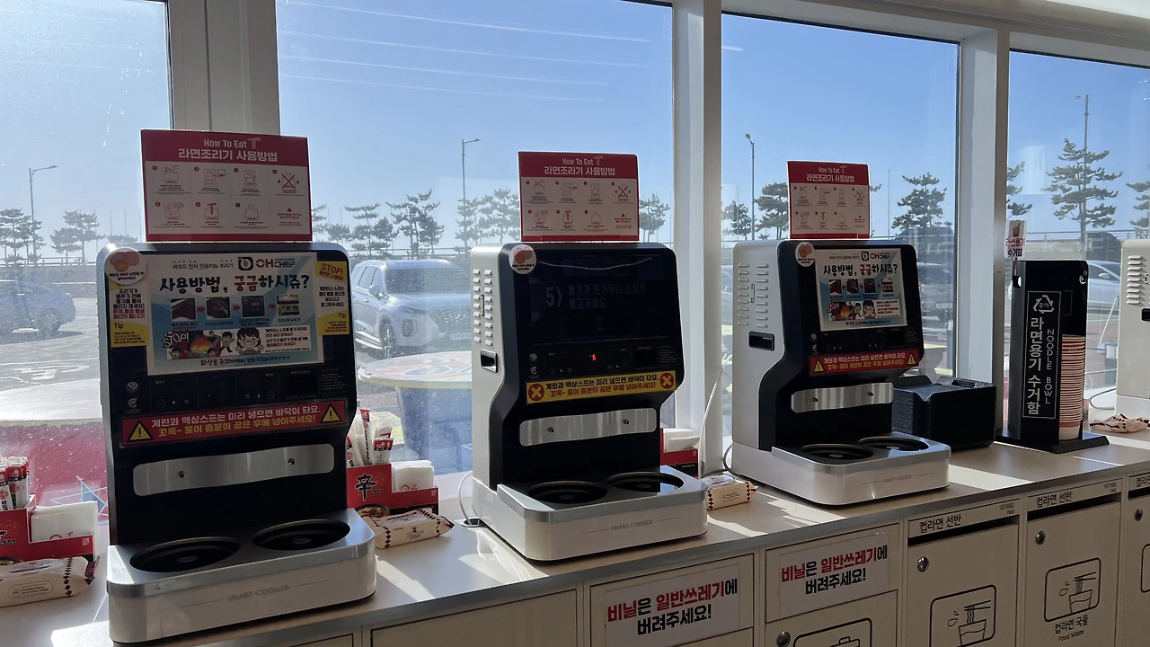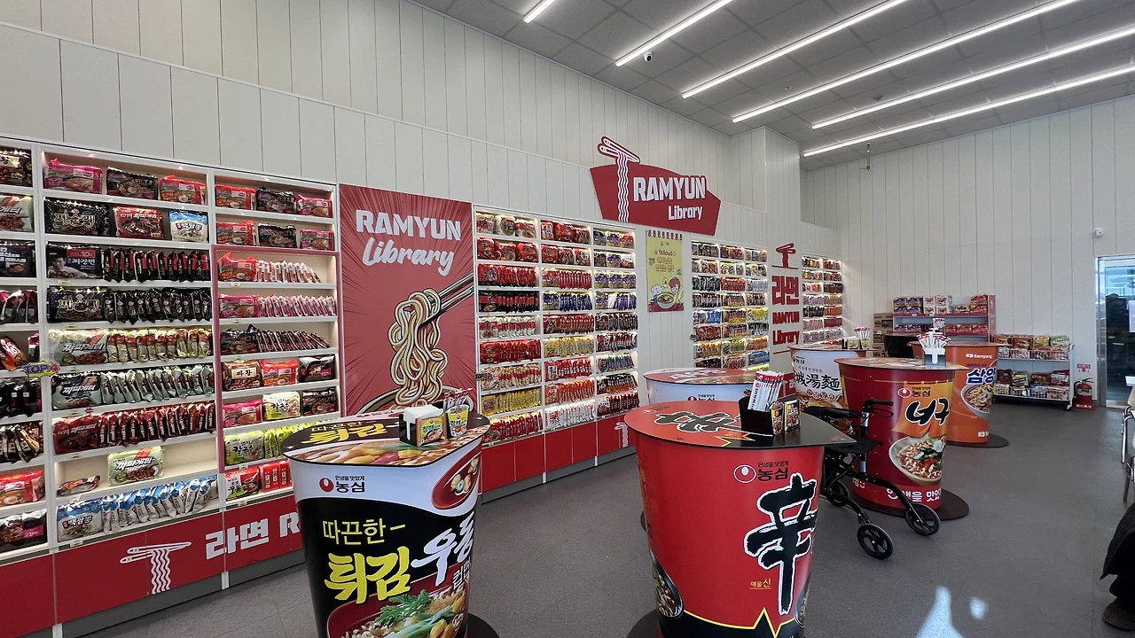 왕산 마리나 편의점에 이렇게 큰 라면 도서관이 생겼다. 모든 종류의 라면들이 책처럼 가지런히 꽂혀서 존재감을 드러내고 있었다. 이 많은 라면이라니! 평일이었지만 라면 도서관에는 꽤 많은 사람들이 드나들었다. 우리도 라면을 하나씩 골라 보았다.