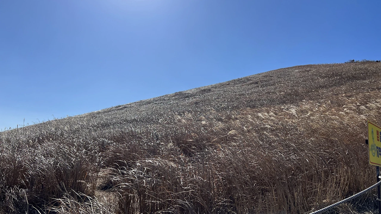 새별오름은 제주 서부 지역의 대표 오름으로 저녁 하늘에 샛별처럼 외롭게 서 있다는 의미가 담겨 있다고 한다. 새별오름이 가을에 억새가 유명하다는 이야기는 종종 들었지만 겨울에도 이렇게 아름다운 억새의 물결이 출렁일 줄은 몰랐다. 따뜻한 겨울 햇살을 받아 반짝거리는 억새를 보며 오름을 오르다 보니 어느새 정상이었다.