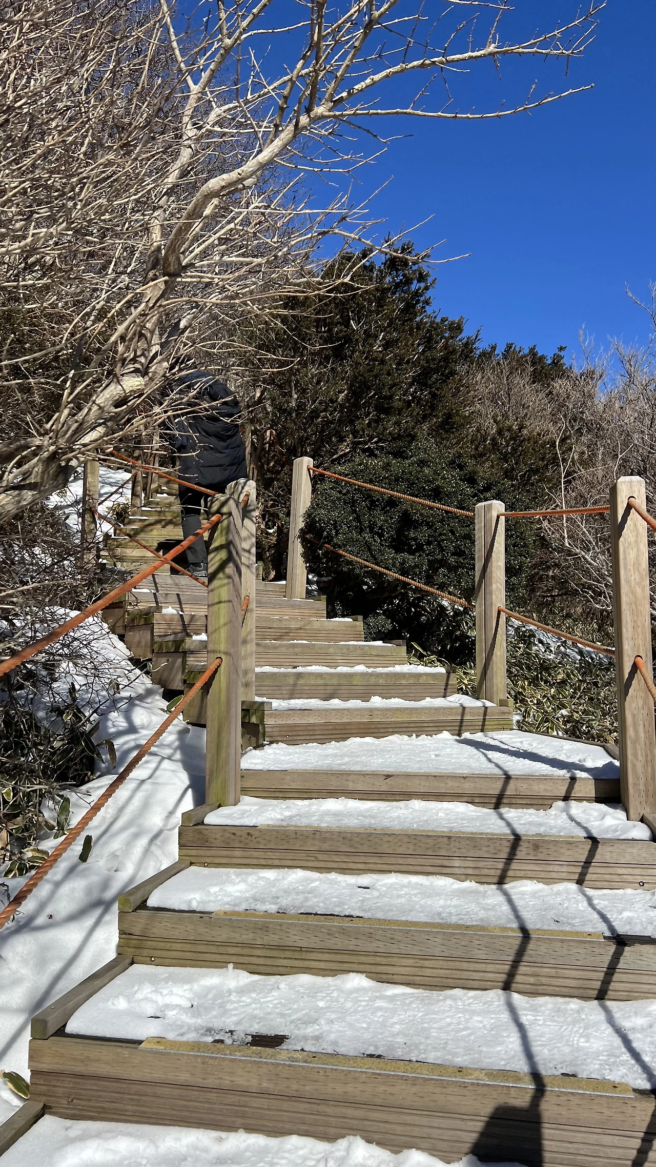 첫 코스로 고사리 해장국을 든든하게 먹고 어승생악으로 향했다. 한라산국립공원 어리목본소로 가면 윗세오름으로 가는 어리목탐방코스와 어승생악 탐방로 두 개의 코스로 나뉘는데 우리는 이번에 가볍게 어승생악을 오르기로 했다. 날씨가 이렇게 좋을 줄 알았다면 윗세오름을 찍고 남벽까지 보고 왔으면 좋았을 텐데 하는 아쉬움도 살짝 있었지만 윗세오름은 다음 여정으로 남겨두기로 했다. 한라산 중턱에 위치한 어승생악은 편도 1.3km 정도로 30분 정도면 정상까지 올라갈 수 있어 부담 없이 한라산을 느낄 수 있는 곳이다. 아무리 짧은 코스라도 눈이 쌓인 겨울에는 아이젠이 필수다. 우리는 아이젠을 착용하고 천천히 등산로를 올랐다.