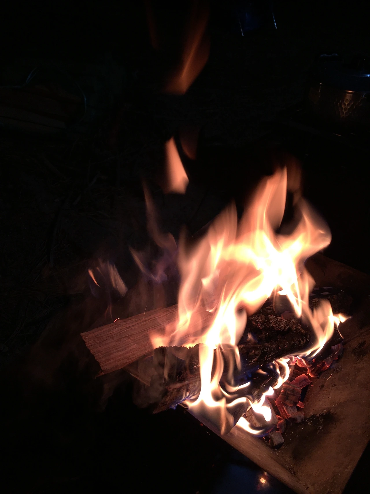 샤부샤부에 우동 사리까지 넣어 일찍 저녁을 지어먹고는 우리는 다시 텐트 밖으로 나왔다. 거의 일 년 만에 화로대에 불을 피우는 것이었기 때문에 불멍 시간을 제대로 즐기겠다는 무언의 합의가 있었던 것이다. 밖은 어느새 파란색이 되어있었다. 해가 많이 짧아졌네 이런 이야기를 하면서 렌턴에 불을 붙였다. 그리고는 사그라지던 화로대의 불씨를 살리기 시작했다.