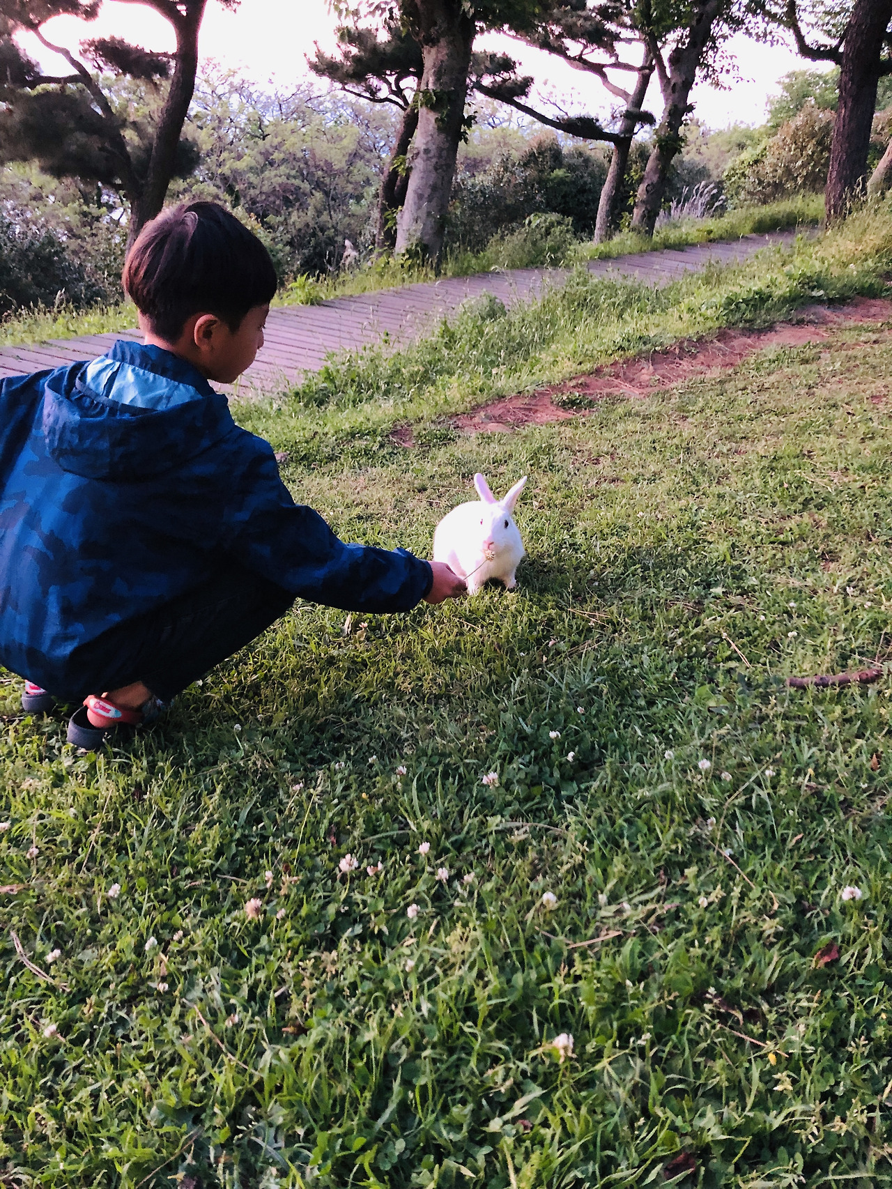 어디 자리를 잡고 해넘이를 볼까 옆지기와 이런저런 이야기를 나누는데 아이들이 나를 부르러 왔다. 이유인 즉, 공원에 토끼가 있다는 것이다. 아이들을 따라가 보니 풀밭 위에 하얀 토끼 서너 마리가 자유롭게 뛰어놀고 있었다. 토끼풀을 맛있게 먹어주는 토끼와 꼬마의 몸 위로 낮은 햇빛이 또 한 움큼 떨어졌다. 조만간 수평선으로 들어가 버릴 빛이었다.