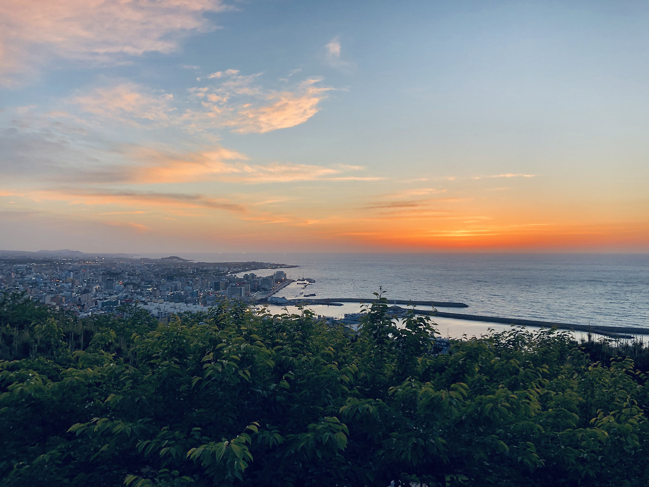 해가 지고 나서 체육공원에 있는 팔각정에 올라갔다. 팔각정에 올라가고 나서야 왜 여기가 일몰 포인트인지 알게 되었다. 바다 위로 떨어지는 해만 생각했는데 그곳에서는 제주항의 기다란 방파제와 마침 반짝이기 시작하는 제주 시내의 모습이 한눈에 보였으니. 거기다 노을빛이 번져가는 하늘과 어두워지는 사라봉의 나무들이 해넘이의 시간을 너무나 아름답게 만들어주고 있었다. 해변에서 보는 해넘이와는 또 다른 느낌이었다.
