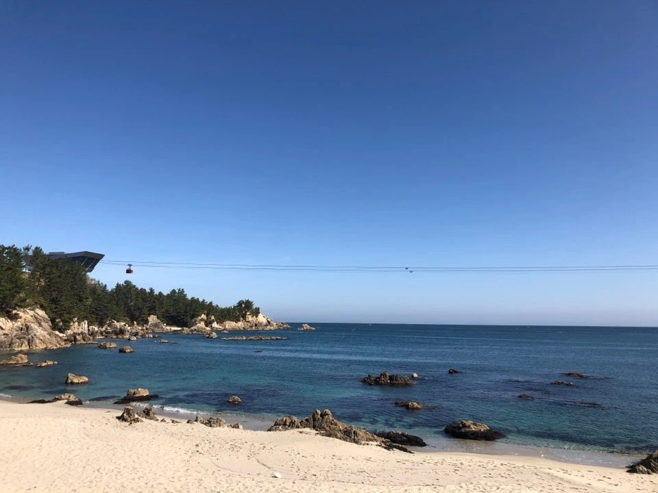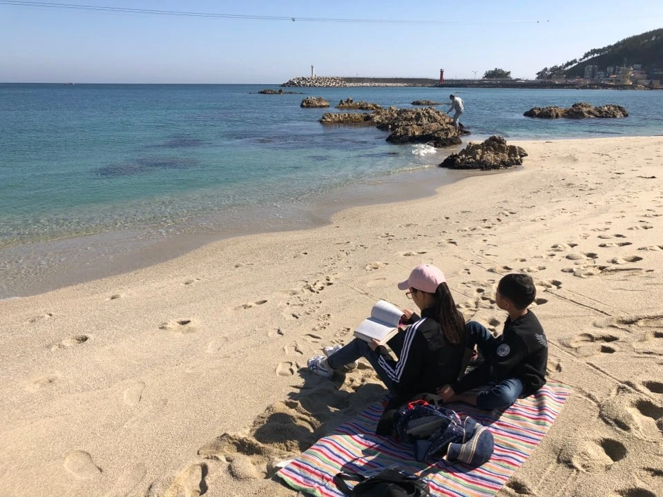이틑날은 햇살이 더욱 좋아서 해변으로 가서 오전 시간을 보내기로 했다. 해변에 매트를 깔고 앉아 책을 읽기도 하고 그림을 그리기도 하고, 조개껍질을 줍기도 하고, 누워 하늘을 보기도 했다. 그러다 잔잔한 바닷물에 손을 담갔다가 물이 꽤 차가워 놀라기도 하였다. 그리곤 부지런히 이른 산책을 마친 사람들의 발자국을 따라 걸어보기도 했다. 오후에는 느긋하게 점심을 먹고 삼척해상케이블카를 타러 갔더니 주말 오후라 그런지 대기 인원이 너무 많았다. 그래서 장호리와 용화리를 잇는 케이블카의 스릴 있는 바다 관람은 다음으로 미루고, 우리는 텐트와 해변에서 느긋한 시간을 보내기로 했다.