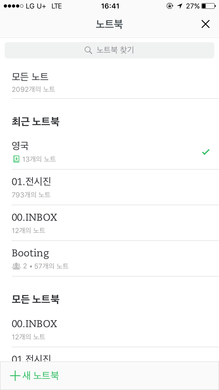 노트북 목록이 어디로 갔나 찾아봤더니 상단에 있었다. 첫 화면에서 '모든 노트'를 누르면 노트북 목록이 나왔다. 다른 노트북을 보고 있을 때 맨 위에 '모든 노트'와 '알리미'를 고정 시킨 것은 너무나 좋다. 알리미 기능은 활용하지 않지만 모든 노트를 누르는게 편하다. 이 때문에 자주 활용하는 노트북은 최상단에 배치하여 접근성을 더욱 높일 수 있다. 메인UI부문에서 말했다 싶이 터치 과정 하나가 삭제되어 접근성이 향상되었다.