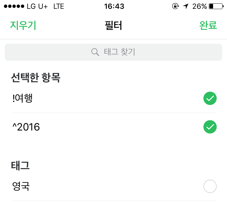 검색에 자주 활용하는 기능 중 하나는 태그 필터링이다. 태그테이블을 작성하고 태그를 활용한 검색을 많이 한다. 이전에는 'tag:!여행 tag:^2016'이런식으로 모두 입력해야 태그 검색을 할 수 있었다.(나만 이렇게 사용한건가?) 모바일에서는 빠른 타이핑이 힘들어 불편함을 조금 느꼈다. 업데이트 후에는 상단 검색창 오른쪽에 태그모양을 누르면 필터가 나온다. 필터 검색창에는 '여행'만 작성하면 오른쪽에 선택버튼을 통해 복수 태그 검색을 빠르게 이용할 수 있다. 이제 태그 검색할 때 타이핑하지 않아도 된다고 생각하니 너무나 행복하다.