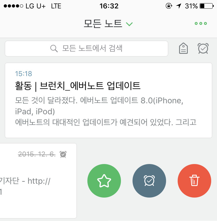 맥북에서 에버노트의 디자인이 윈도우보다 깔끔해서 맥북을 구매하게 된 나다. 이번 아이폰의 업데이트는 언제 나올지 모르는 안드로이드 버전에 비해 너무나 깔끔한 디자인들을 넣어주었다. 지금은 다행이 아이폰을 사용하고 있어서 업데이트를 확인할 수 있었다. 그러나 안드로이드를 사용하는 중에 스마트폰을 바꿀 시기가 되었다면 아마 빠른 시일내에 아이폰으로 바꾸지 않았을까 싶다.