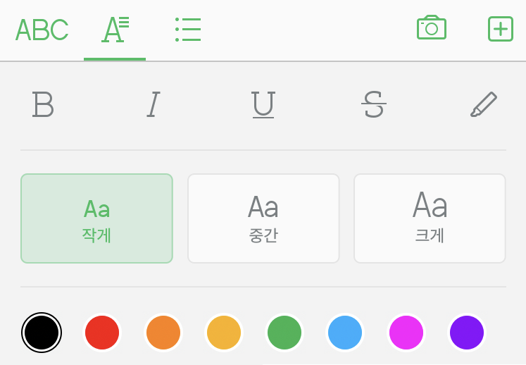 마지막 좋은 기능은 텍스트 편집 기능이다. 모바일에서는 자유로운 편집이 힘들어서 타이핑만 해두고 컴퓨터에서 작업하곤 했다. 이전 업데이트에서는 단순하게 3단계의 글자 크기와 알록달록 8가지 색깔로 화려한 편집이 가능해졌다. 한가지 사소하게 편리함을 느낀 기능은 텍스트편집 옆에 ABC 아이콘을 통해 타이핑으로 금방 돌아올 수 있다는 점이다. 이전에는 타이핑 영역을 클릭해야 해서 손가락이 화면 위로 많이 올라가곤 했었는데 키보드 바로 위에 배치됨으로 손가락의 이동반경이 줄어서 편해졌다.